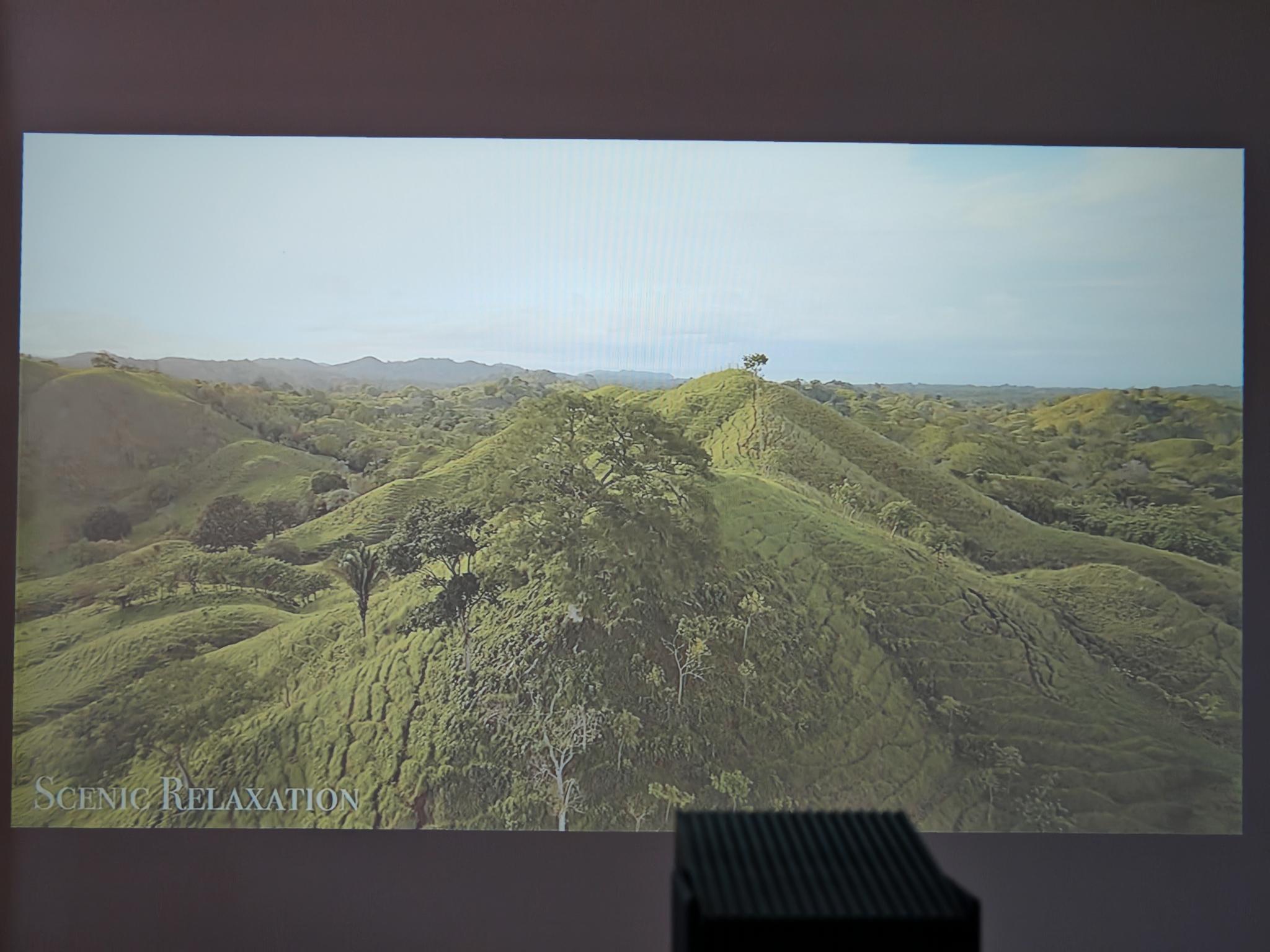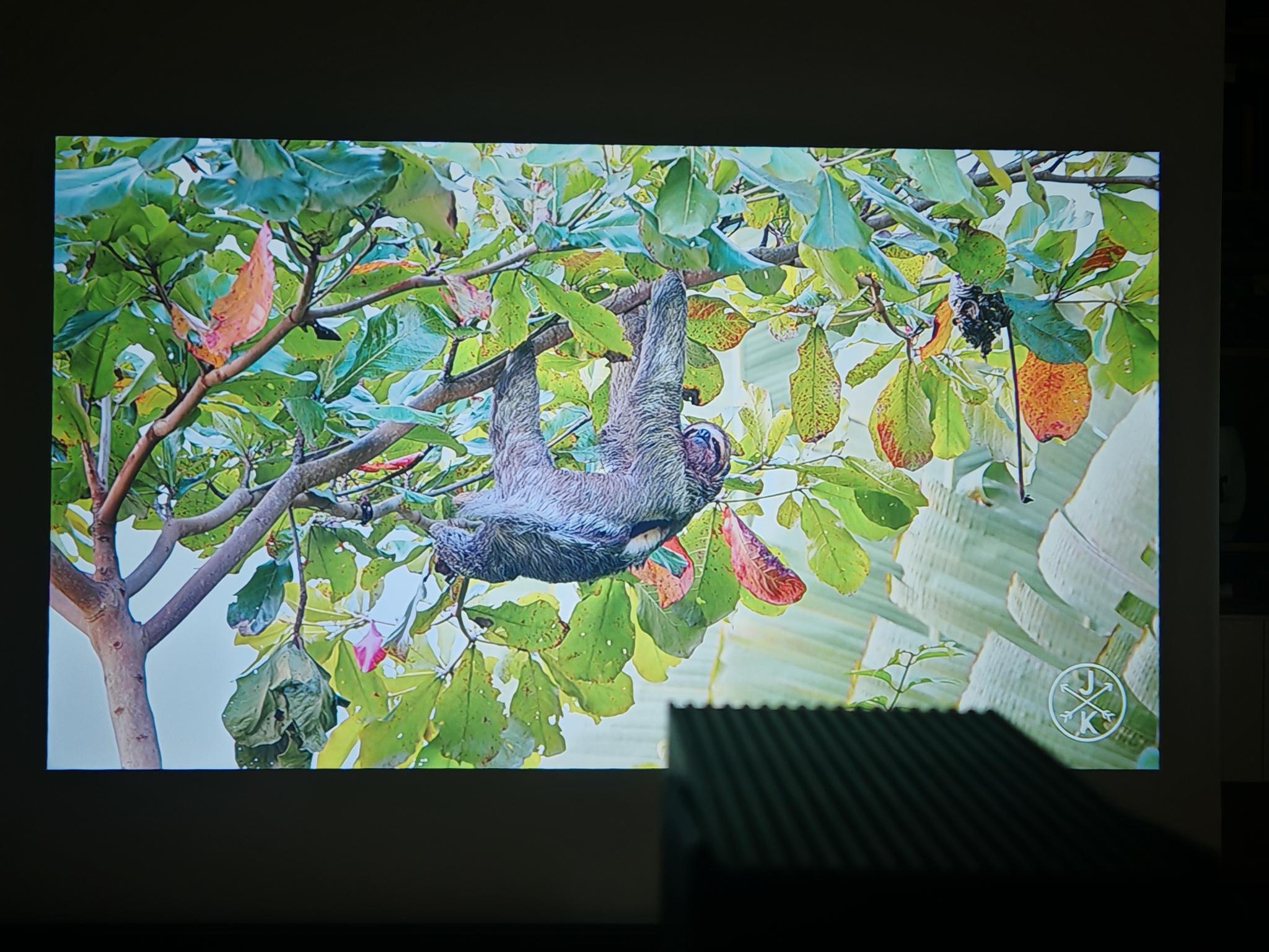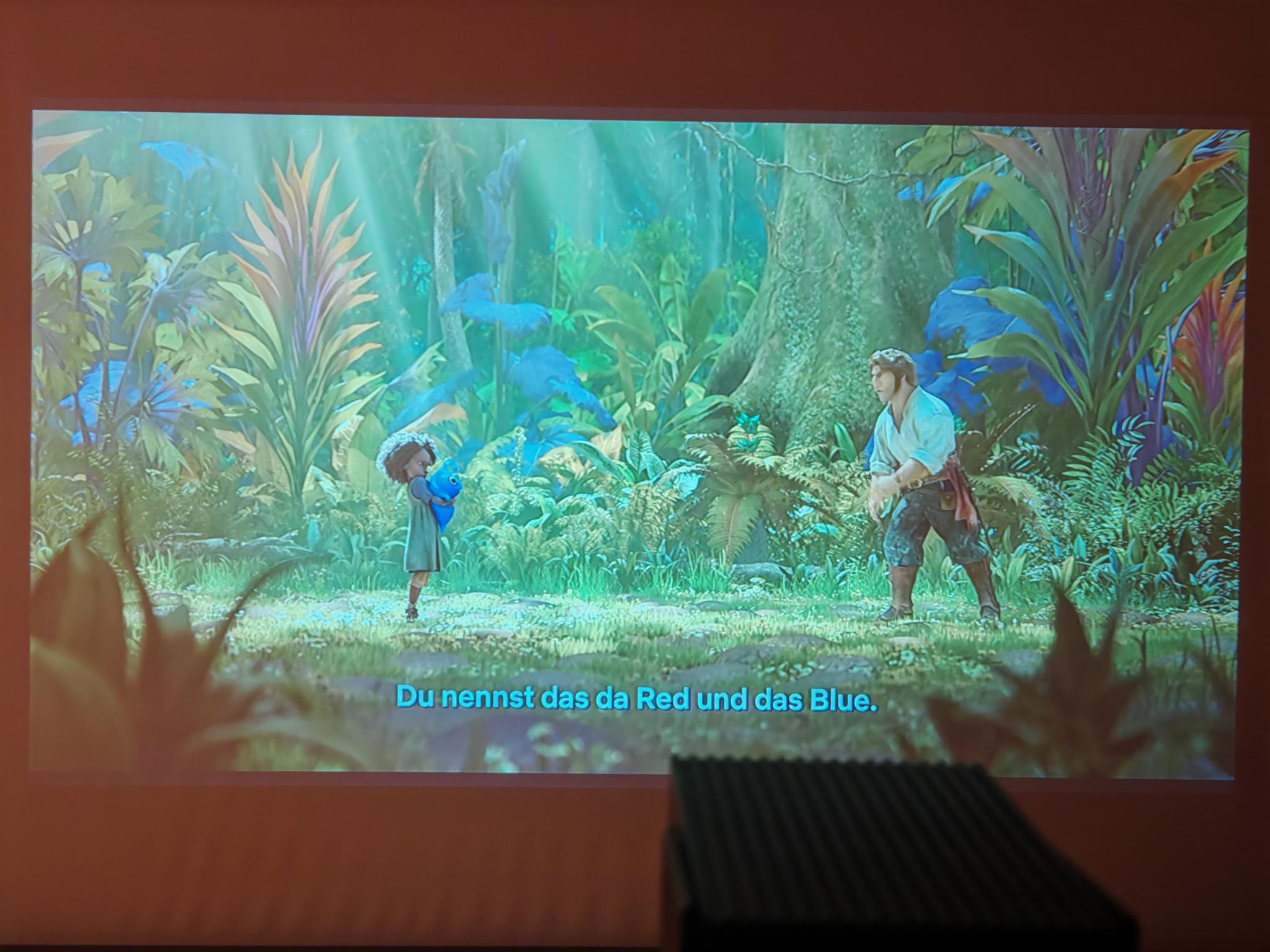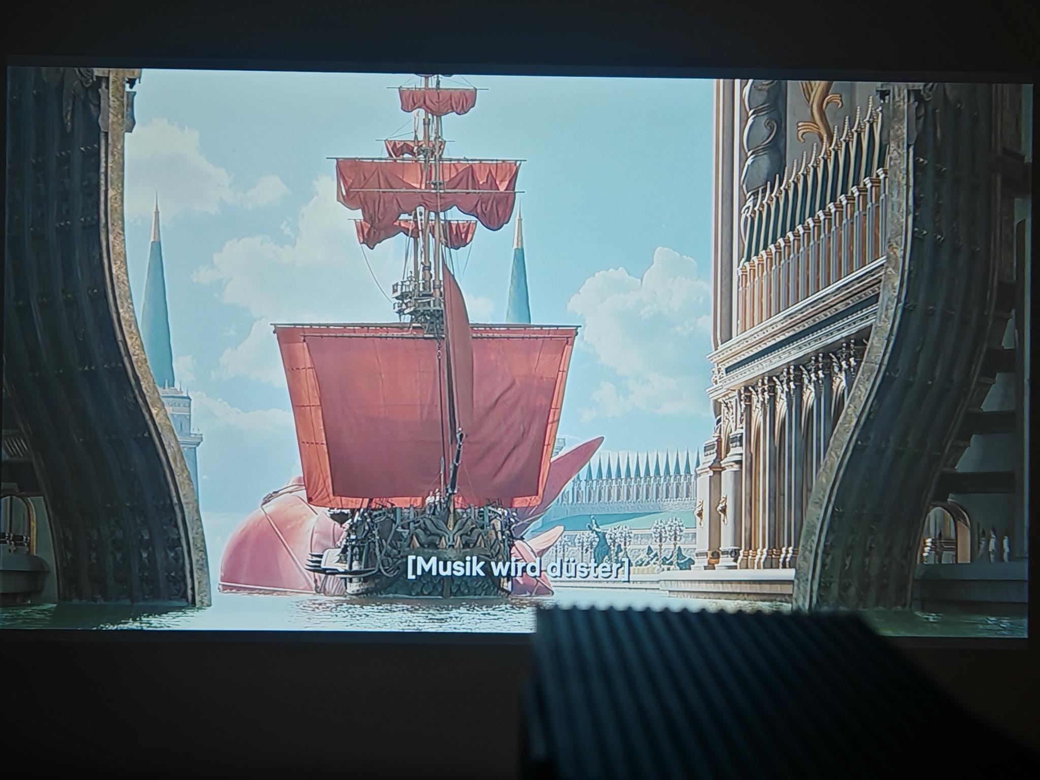 Nach der Bildeinstellung liefert der Wanbo Cube 2 Pro eine recht lebendige, helle und ansehnliche Projektion. Bei dunklen Bereichen schafft der Beamer es leider nicht, ein sattes Schwarz darzustellen. Ungünstigerweise sieht man bei Videos in heller Umgebung, dass das Bild recht ungleichmäßig ausgeleuchtet ist. Dies fällt erst auf, wenn ihr die Ecken im Vergleich zur Bildmitte genauer betrachtet. Sollten euch die Farbeinstellungen des Beamers nicht gefallen, könnt ihr über Farbprofile und die manuelle Einstellung noch einiges nachregeln. Ich persönlich fand die „Standard“-Bildeinstellung beim Cube 2 Pro am natürlichsten.