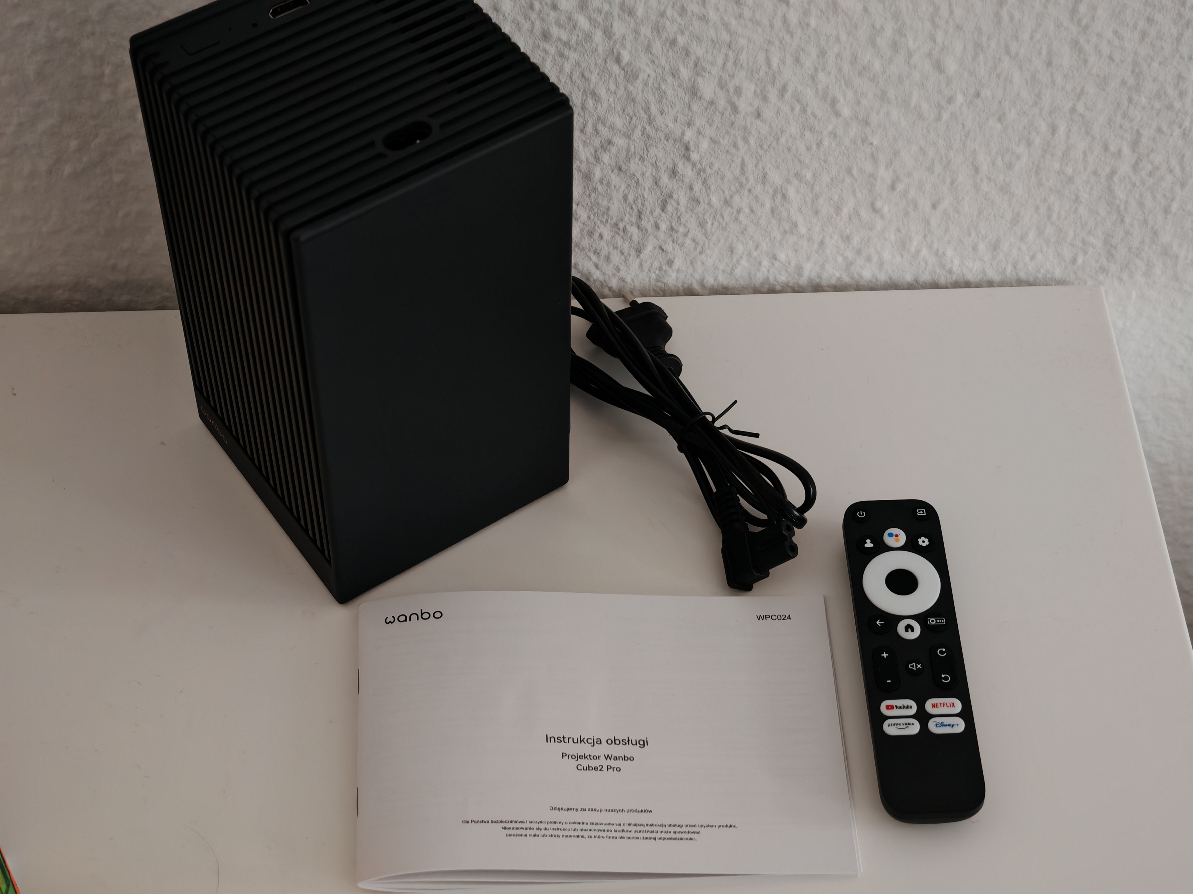 Der Lieferumfang ist, wie bei Wanbo üblich, recht spärlich. Neben der Bluetooth-Fernbedienung legt der Hersteller ein 1,5 Meter langes AC-Kabel und eine mehrsprachige Bedienungsanleitung bei. Ein Linsenschutz wäre bei dem Gerät allerdings nicht sinnvoll und eine Tasche eher unnötig, da der günstige Wanbo Cube 2 Pro recht robust gebaut ist und selbst bei einem Transport im Rucksack kaum Beschädigungen entstehen dürften.