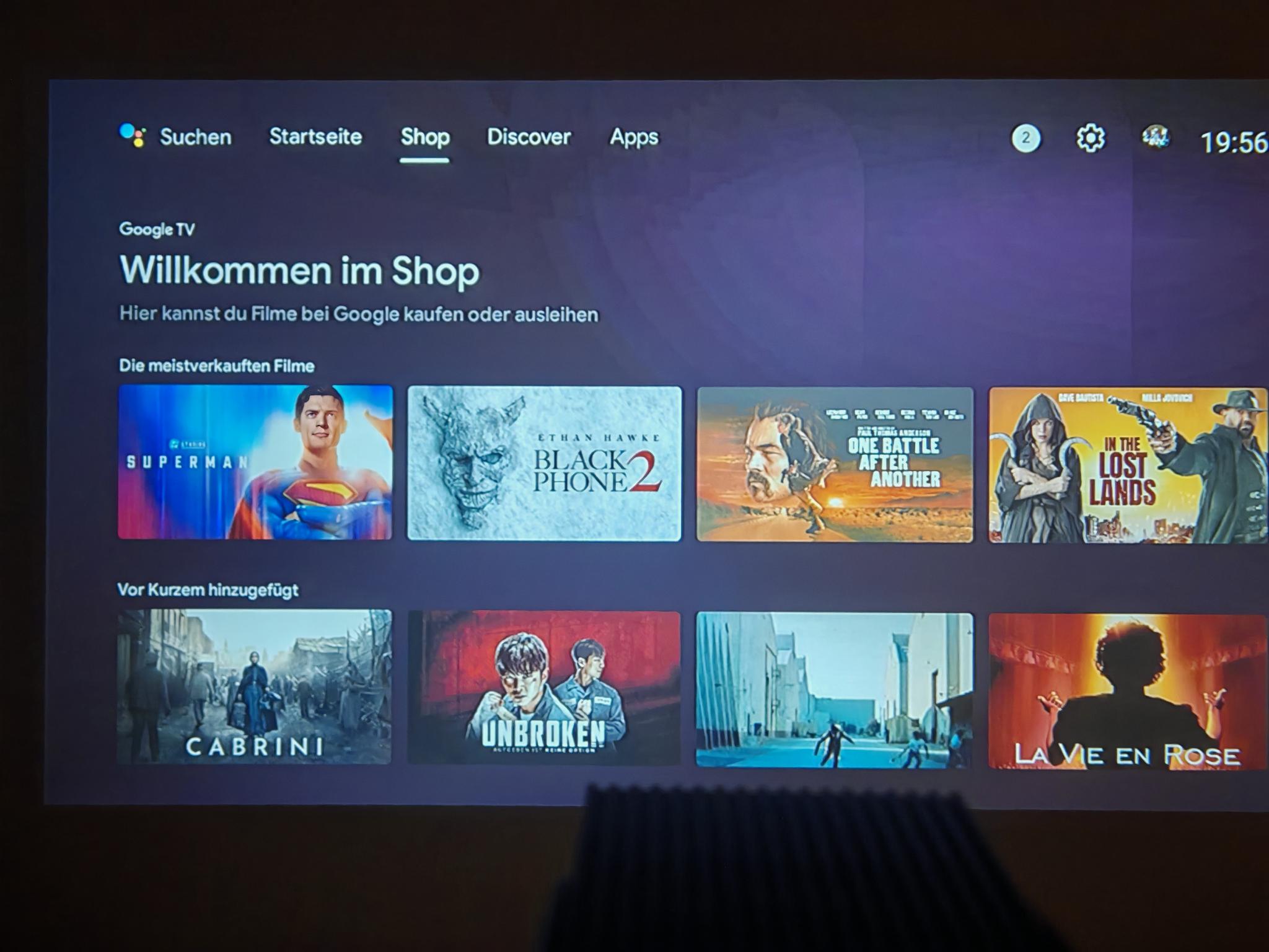 Eines der größten Kaufargumente des hier getesteten Projektors ist die Software. Der Wanbo Cube 2 Pro läuft mit Android TV 11. Der Anmeldevorgang ist damit (mit vorhandenem Google-Konto und Android-Smartphone) in ca. 3 Minuten abgeschlossen. Android TV ist immer eine sichere Wahl als Betriebssystem, da es alle möglichen Apps zum Streamen und Anpassen des Projektors bietet. Zudem bieten die Streaming-Anbieter meist für ihre Apps unter Android- und Google TV schnelle Anmeldemöglichkeiten an, wodurch ihr eure Anmeldedaten nicht manuell einzugeben braucht. Zusätzlich ist der Wanbo Cube 2 Pro mit Widevine L1 ausgestattet, sodass ihr auch Inhalte von Bezahl-Streaming-Diensten in bestmöglicher Auflösung genießen könnt. Die Benutzeroberfläche des Cube 2 Pro ist sehr übersichtlich und intuitiv zu bedienen.