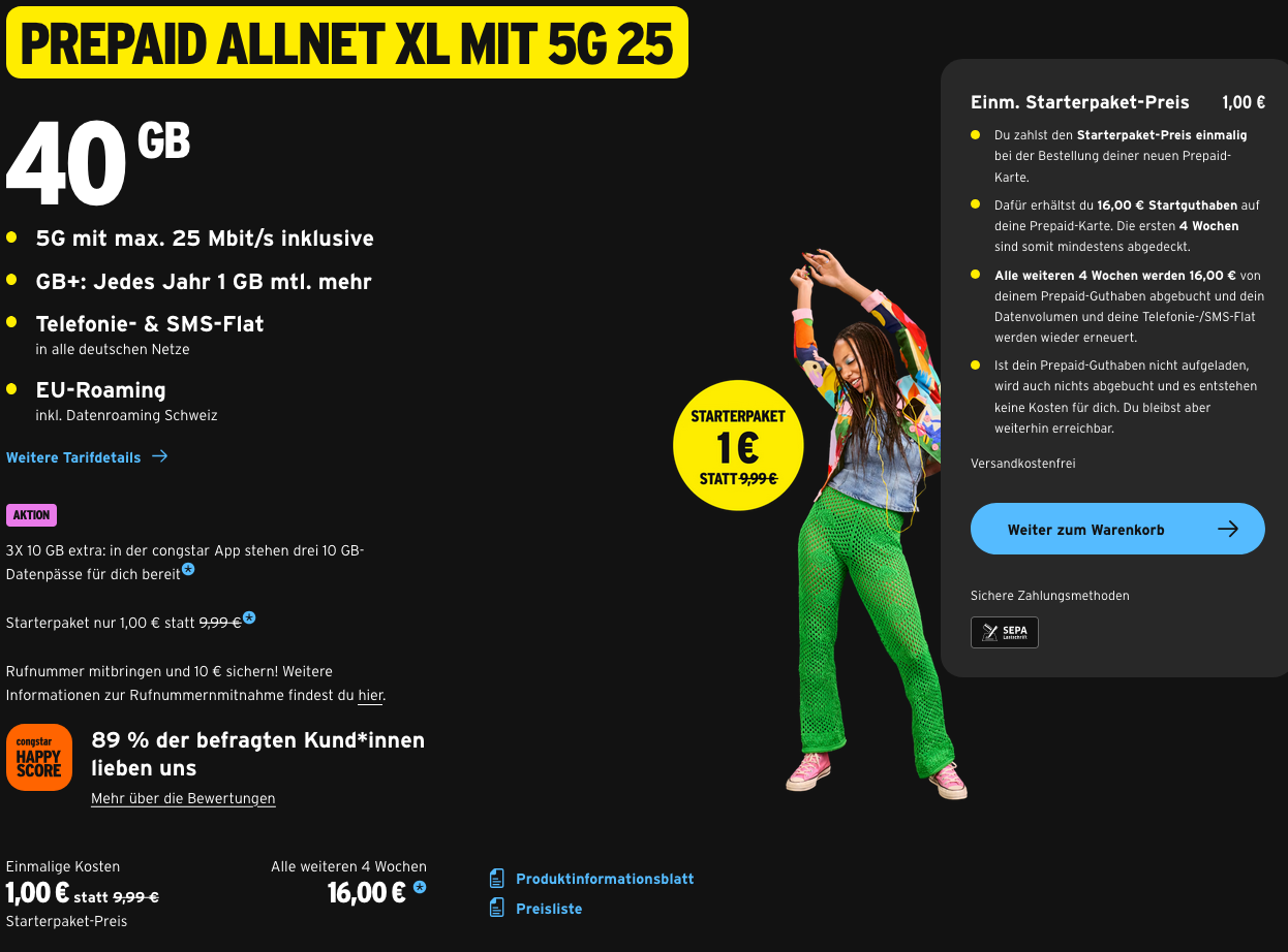 Ansonsten ist der Vertrag mit wichtigen Features wie VoLTE, VoWiFi, einer Allnet-Flat für Telefonie und SMS und natürlich EU-Roaming ausgestattet.