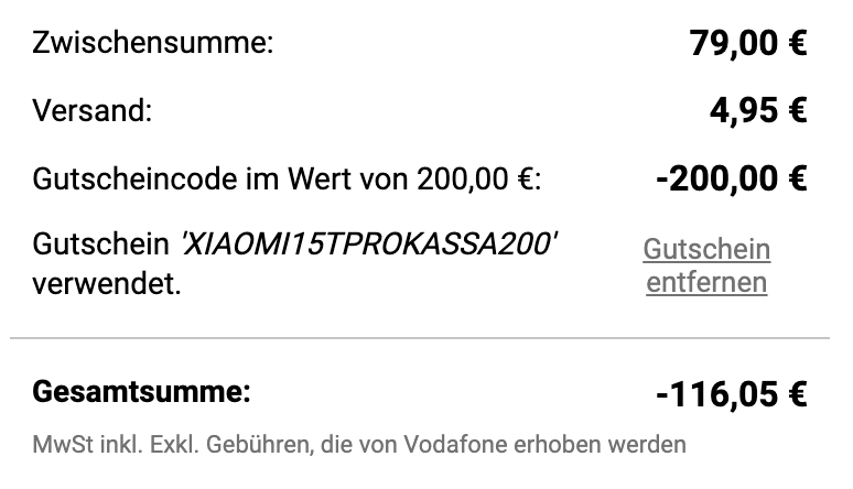 Um den 200€ Rabatt zu erhalten, müsst ihr bei der Bestellung den Code XIAOMI15TPROKASSA200 verwenden. Dadurch rutschen die Kosten für Anschluss und Zuzahlung fürs Gerät ins Minus.