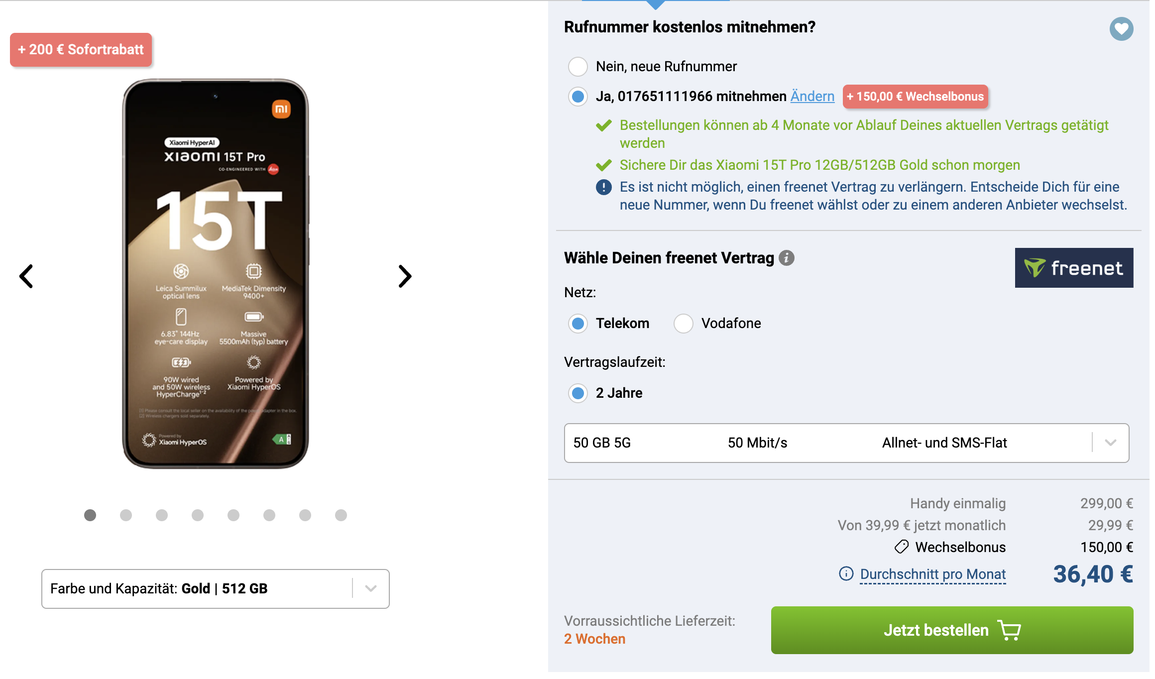 Wenn Ihr auf der Suche nach dem Xiaomi 15T Pro mit einem günstigen Telekom-Vertrag seid, könnt Ihr ein Auge auf das aktuelle Angebot von Gomibo werfen. Mit dem Gutschein “XIAOMI15TPROKASSA200” bekommt Ihr das Gerät zusammen mit einem 50GB Tarif von Freenet im Telekom-Netz. Für diesen Endpreis ist eine Rufnummermitnahme nötig, für die es 150€ gibt.