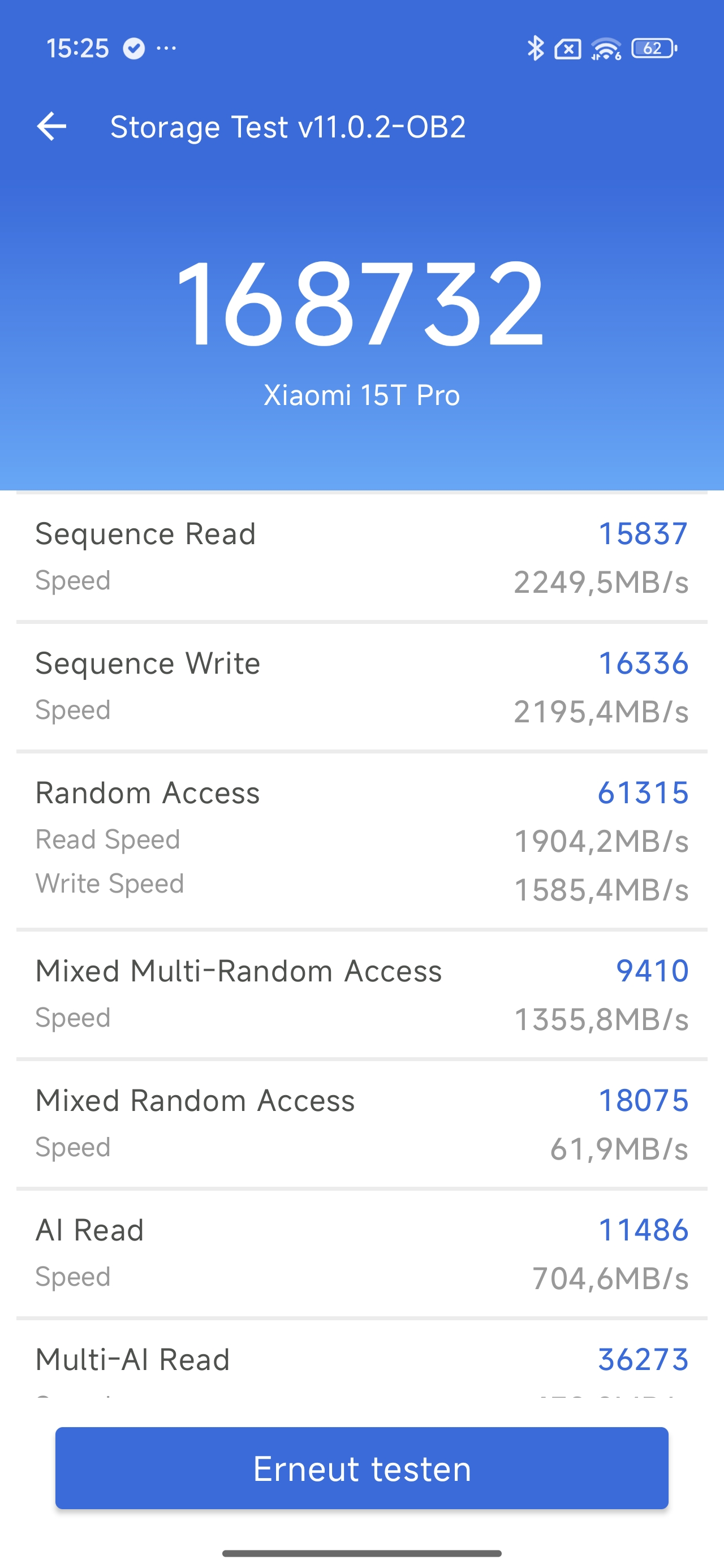Wie schon beim Vorgängermodell setzt Xiaomi auch beim 15T Pro wieder auf einen Spitzenprozessor von MediaTek. An Bord ist der MediaTek Dimensity 9400+, der von einer Immortalis-G925 GPU unterstützt wird. Der Prozessor setzt sich aus einem Cortex-X925-Kern mit 3,73GHz, drei Cortex-X4-Kernen mit 3,3GHz und vier Cortex-A720-Kernen mit 2,4GHz zusammen. Dazu kommen 12GB LPDDR5X Arbeitsspeicher und je nach Variante 256GB, 512GB oder 1TB interner Speicher. Sehr erfreulich ist, dass Xiaomi hier auf den neuesten UFS-4.1-Speicher setzt. Seltsamerweise bleiben die gemessenen Geschwindigkeiten des Speichers von 2,2GB/s im Lesen und Schreiben aber hinter den Erwartungen und sogar hinter der Geschwindigkeit des günstigeren Xiaomi 15T zurück.