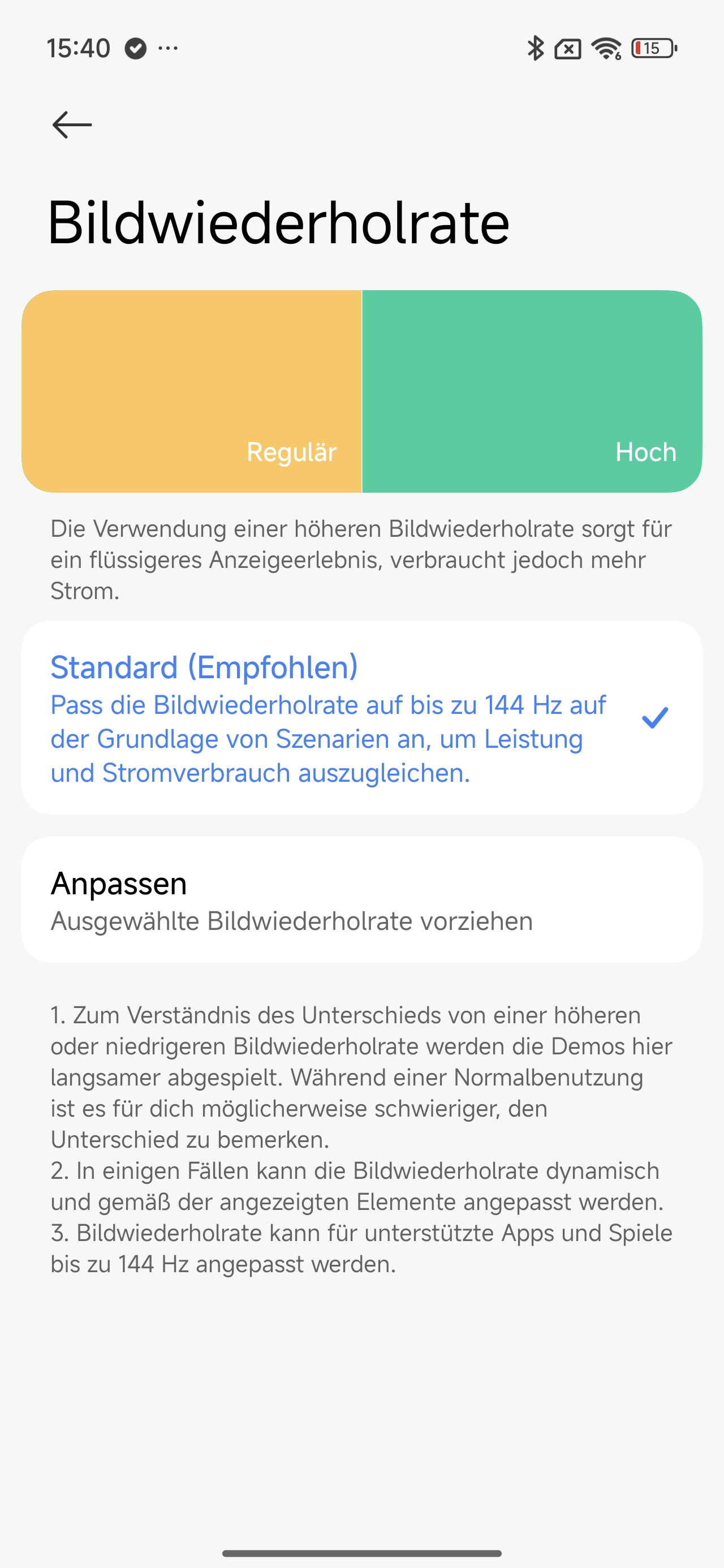 Das Xiaomi 15T Pro setzt auf ein riesiges 6,83 Zoll Display. Dank der AMOLED-Technik und einer hohen Auflösung von 2772 x 1280 Pixel ist die Darstellung jederzeit gestochen scharf; einzelne Bildpunkte sind nicht zu erkennen. Auf dem Papier protzt das Gerät mit einer Bildwiederholrate von bis zu 144Hz, allerdings solltet ihr euch davon nicht blenden lassen. Ein sichtbarer Unterschied zu den üblichen 120Hz ist nicht vorhanden und die Software begrenzt die Anzeige ohnehin fast immer auf 120Hz. Wir konnten in keinem Szenario 144Hz triggern. Die automatische Reduzierung der Frequenz auf 60Hz bei statischen Inhalten oder 30Hz im Always-On-Display funktioniert im Test aber sehr gut und schont den Akku.