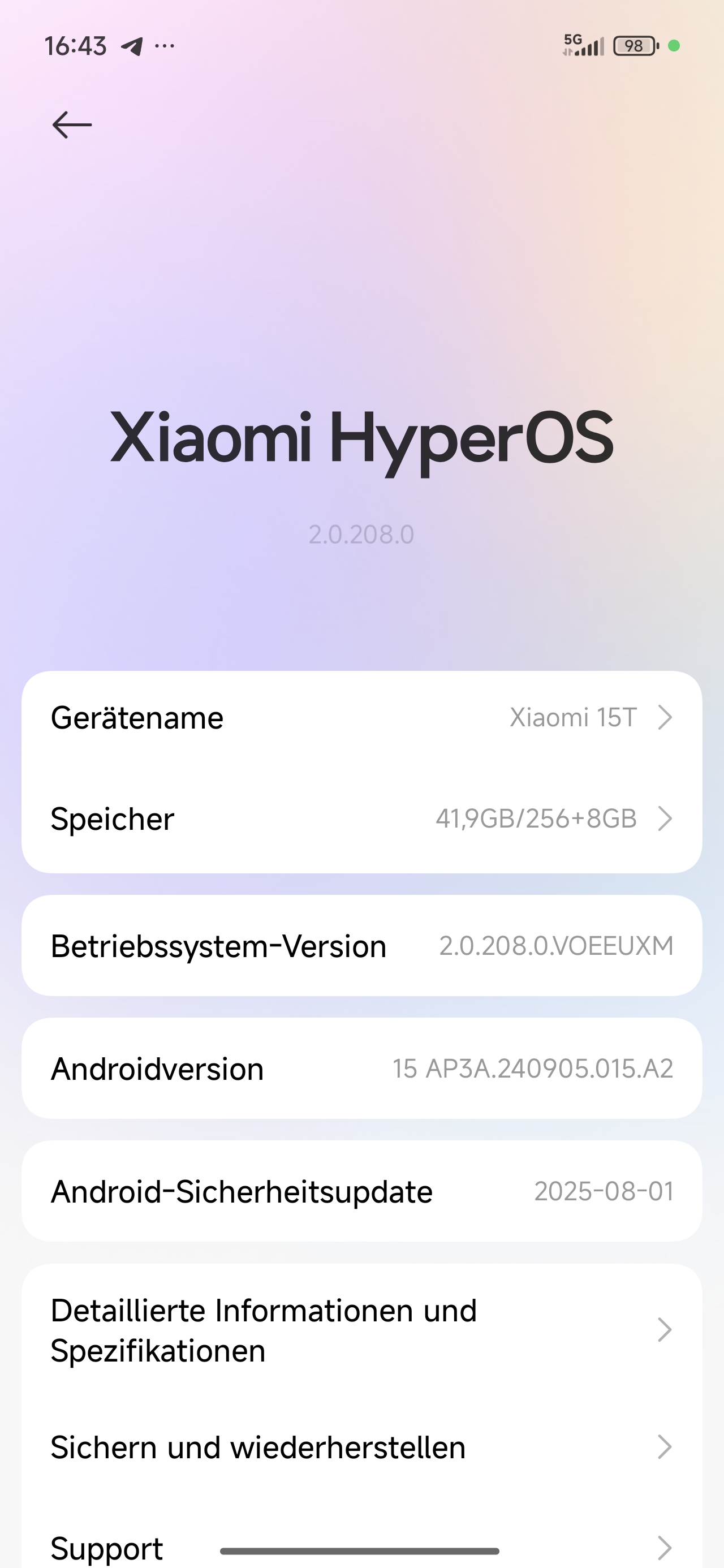 Das Xiaomi 15T wird leider noch mit HyperOS 2 auf Basis von Android 15 ausgeliefert. Allerdings verspricht der Hersteller ein zeitnahes Update auf HyperOS 3 mit Android 16. Xiaomi garantiert für das 15T 4 Jahre Systemupdates und 6 Jahre Sicherheitsupdates.