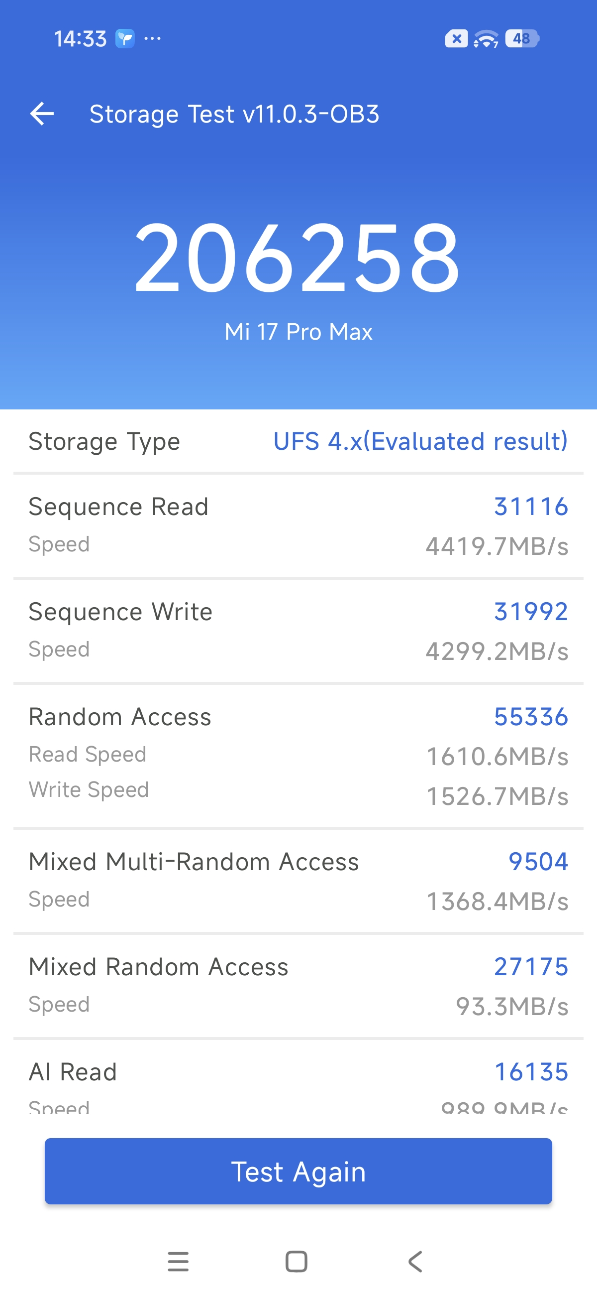 Trotz dieser Einschränkung im Stresstest ist die Gaming-Performance im Alltag hervorragend. Alle aktuellen Titel laufen auf höchsten Einstellungen absolut flüssig. Unterstützt wird der Prozessor von wahlweise 12GB oder großzügigen 16GB RAM. Beim internen Speicher stehen 512GB oder 1TB zur Verfügung. Xiaomi setzt hier auf den aktuell schnellsten UFS 4.1 Speicher. Mit etwa 3,8GB/s im Lesen und Schreiben werden sehr gute Werte erzielt.