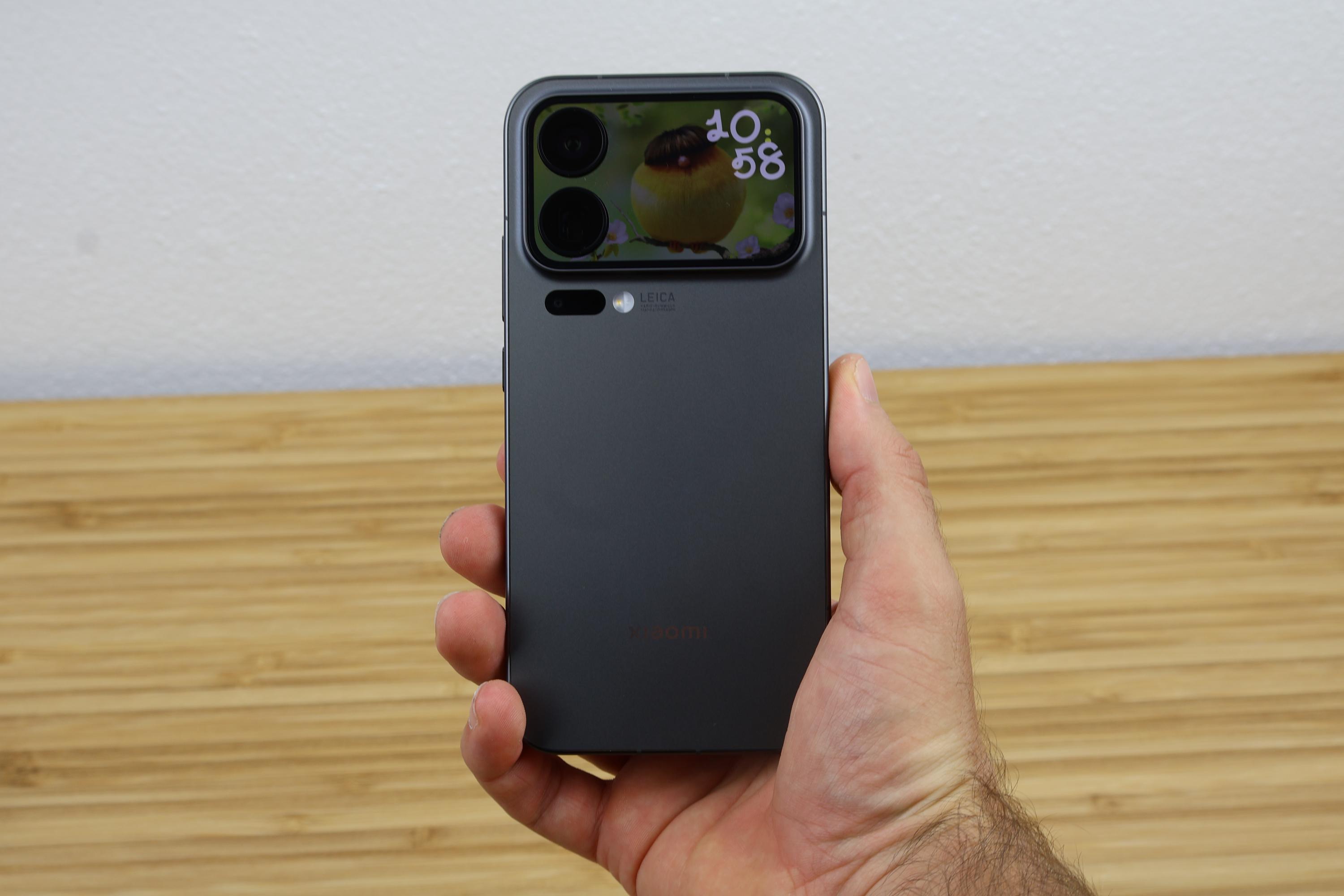 Das absolute Highlight ist das Kameramodul auf der Rückseite, das inklusive Linsen 4,5 Millimeter aus dem Gehäuse hervorsteht. Auffällig ist hier das integrierte zweite Display. Dieses 2,9 Zoll große LTPO OLED-Panel (596 x 976 Pixel) zeigt Benachrichtigungen, Anrufe oder Timer an und lässt sich mit Xiaomis hauseigenen Designs oder eigenen Wallpapern anpassen. Der praktischste Anwendungsfall ist jedoch die Nutzung als Kamera-Sucher für Selfies und Videos. Die App-Integration ist im Moment aber noch ziemlich begrenzt: Außer Spotify funktioniert keine westliche App. Etwas ungewöhnlich ist die Platzierung der Ultraweitwinkel-Kamera und des LED-Blitzes, die sich unterhalb des Hauptmoduls befinden.