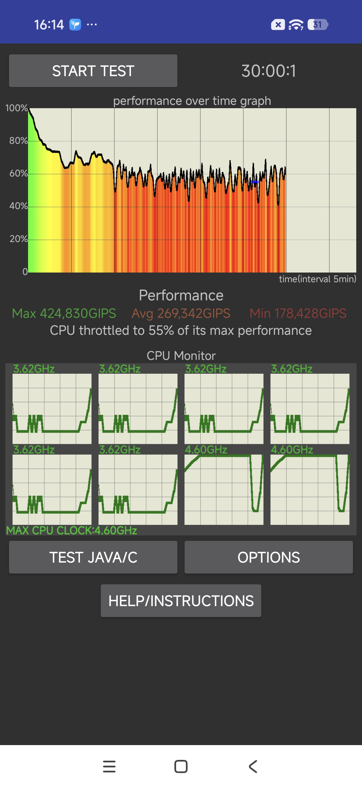 Der Grund für die niedrigen Werte in den Standard-Benchmarks dürfte im Hitzemanagement liegen. Das Thermal Throttling ist nicht überzeugend. Im CPU-Stresstest fiel die Leistung bereits nach weniger als 10 Minuten auf nur noch etwa 55% des Ausgangswertes. Bei der GPU-Dauerleistung sieht es mit 62% Stabilität ein bisschen besser aus, wobei wir da von Xiaomi eigentlich Besseres gewohnt sind. Für den normalen Alltag ist das irrelevant, doch wer lange, intensive Gaming-Sessions plant, wird in ein paar Jahren nicht die volle Dauerleistung abrufen können.