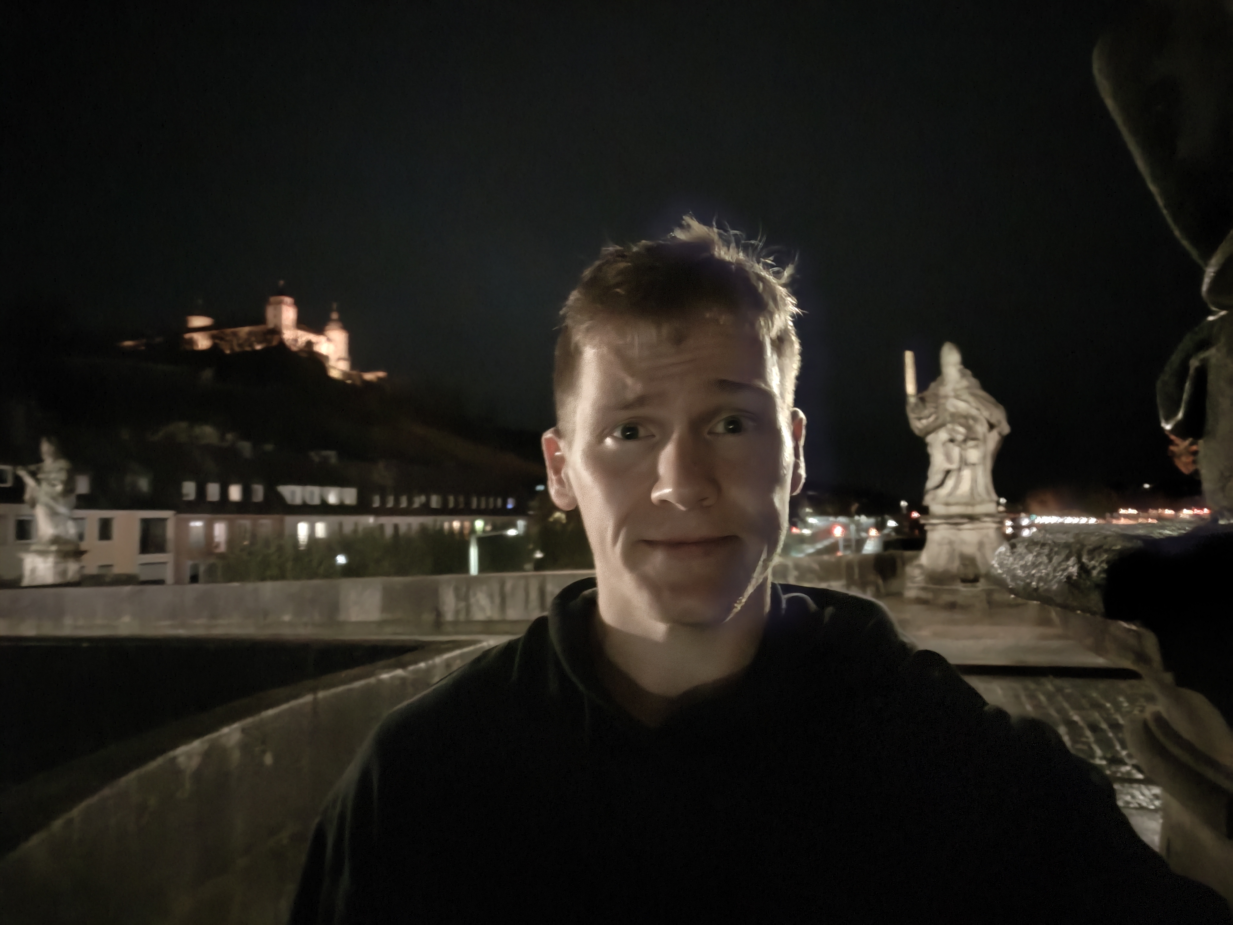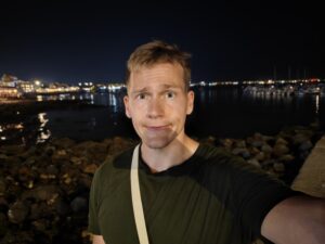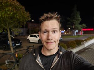 Bei Nacht hingegen lohnt der Wechsel zur eigentlichen Hauptkamera mithilfe des Zweitdisplays. Die Hauptkamera eliminiert sämtliches Rauschen und bietet exzellente Nachtselfies. Durch die große Blende rückt die Kamera Selfies in ein natürliches Bokeh. Wer Selfie-Portraits bevorzugt, nutzt auch die Hauptkamera bei Tag. Nützlich ist auch die Ultraweitwinkelkamera für Selfies. So gelingen Gruppenselfies oder ihr nehmt einen großen Teil der Kulisse mit auf.