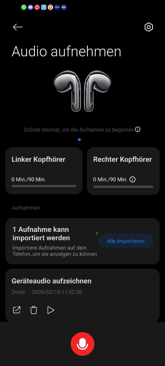Ist der Speicher voll, endet die Aufnahme automatisch. Ihr leert den Speicher über die App, wo ihr die Dateien löschen oder auf euer Smartphone herunterladen könnt. Vor dem Download lassen sie sich nicht abspielen. Wenn beide Kopfhörer gleichzeitig aufnehmen, entsteht theoretisch eine Stereo-Aufnahme, ihr müsst die Tonspuren jedoch manuell am Rechner zusammenlegen. Die Aufnahmefunktion lässt sich auch aktivieren, während die Buds in der Station liegen – vorausgesetzt, der Deckel bleibt geöffnet.