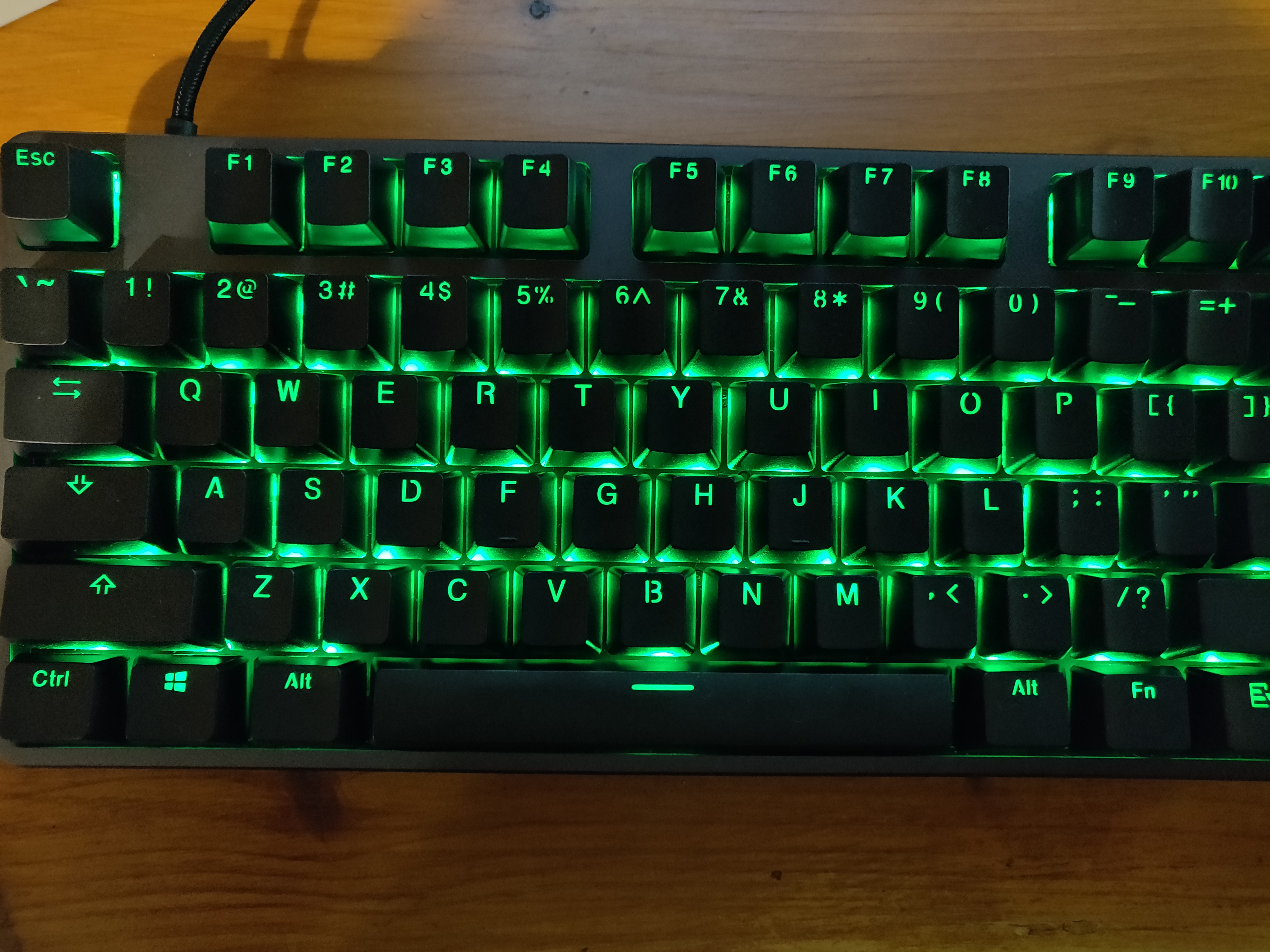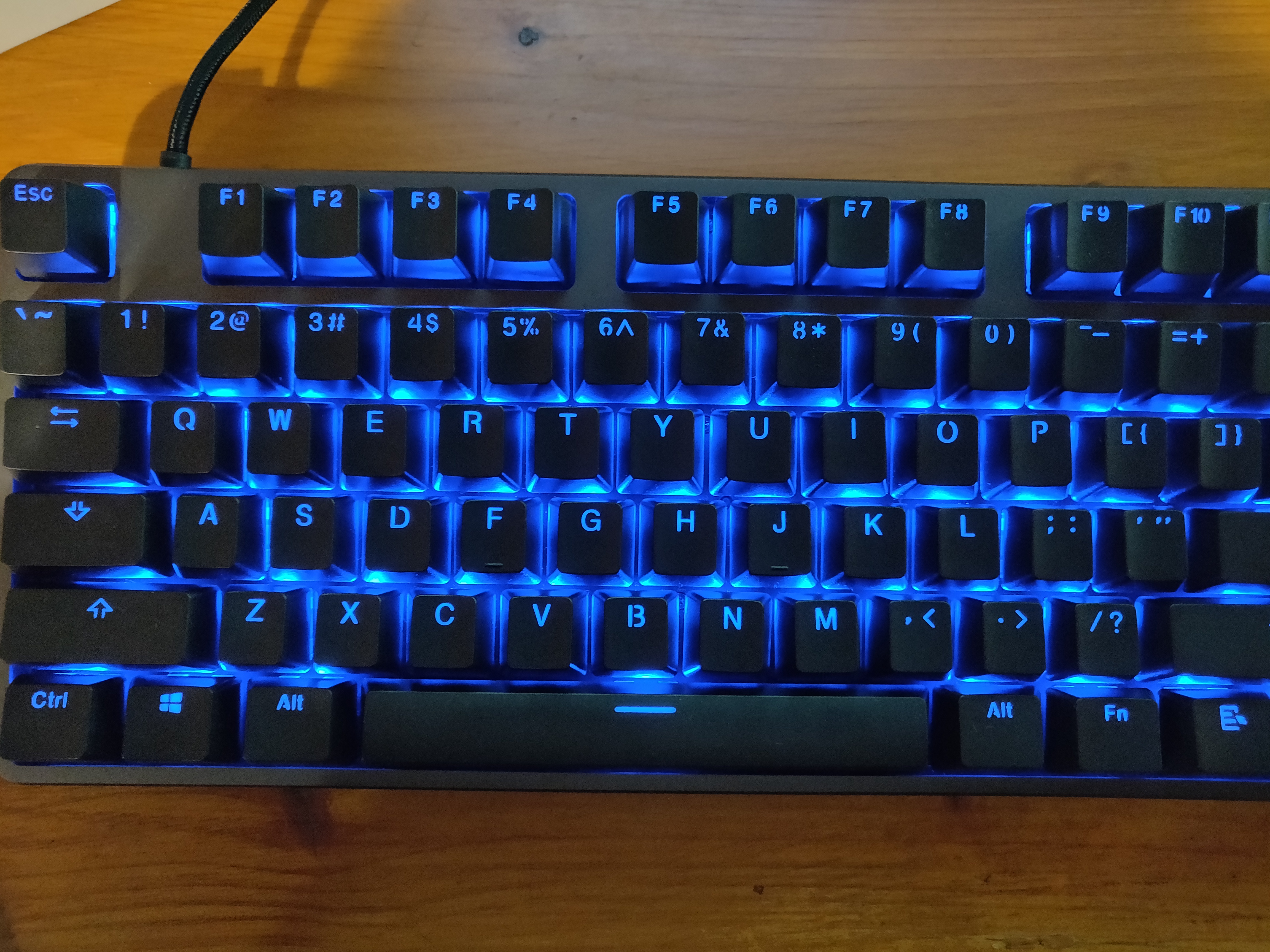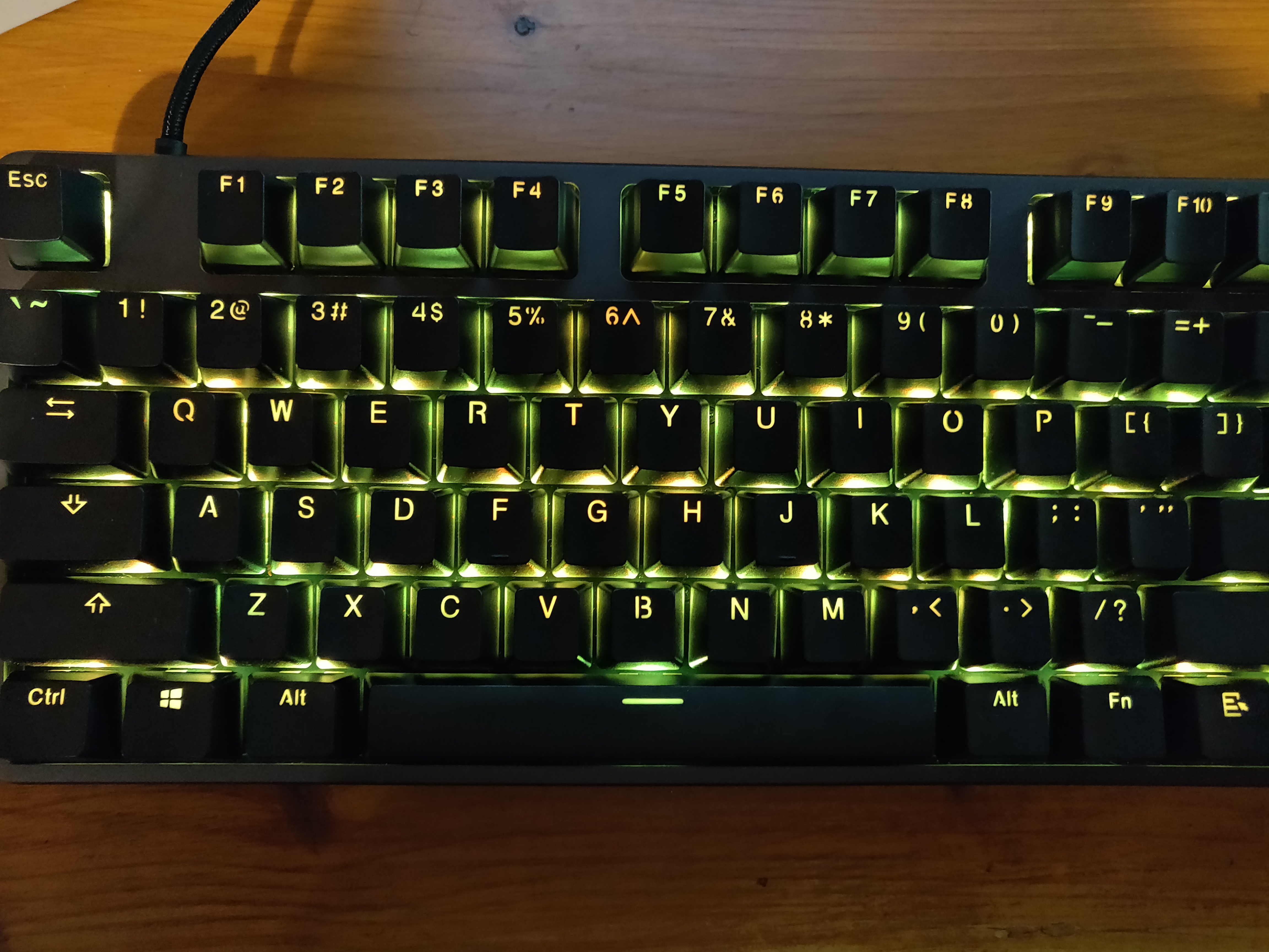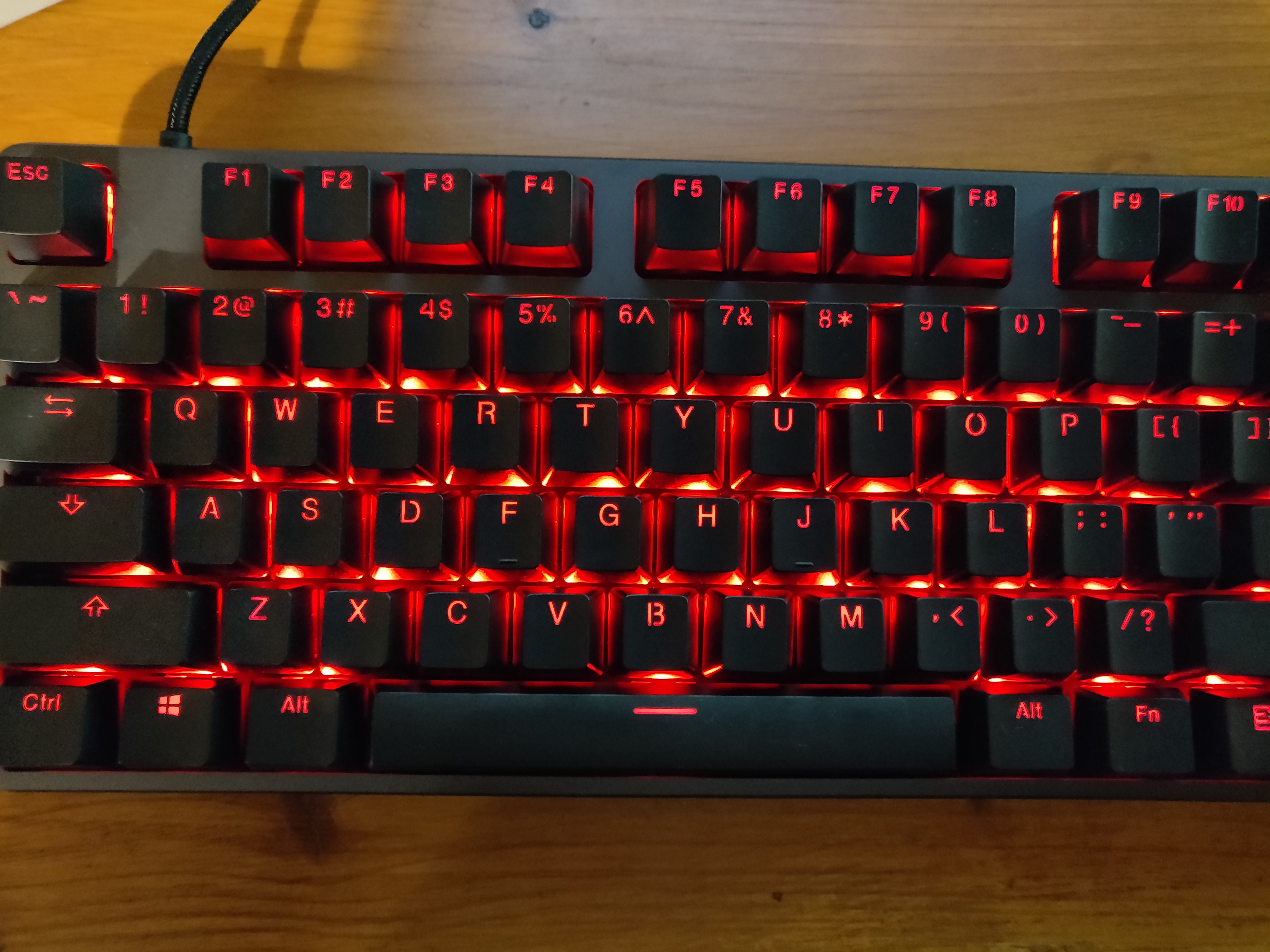 Die Grundfarbe der gesamten Beleuchtung ist Rot, doch gibt es je nach Einstellung das gesamte Farbspektrum zu begutachten. Denn die Tastatur kommt mit einer Vielzahl an einstellbarer Lichtmodi, von denen einige weiter unten in den Videos zu sehen sind. Umschalten lassen sich die Modi via FN-Taste, die man meist von Notebooks kennt und dazu dient, auf eine zweite Tastenbelegung umzuschalten. Von der Reklametafel, bei der die Farbe von der Seite einfliegt, bis hin zum Regenbogen, ist eigentlich alles möglich. Mir hat dabei besonders die Einstellung gefallen, bei der sich mit jedem Druck eines Buchstabens, die Farbe für den Tastaturbereich ändert, in dem dieser Buchstabe liegt.