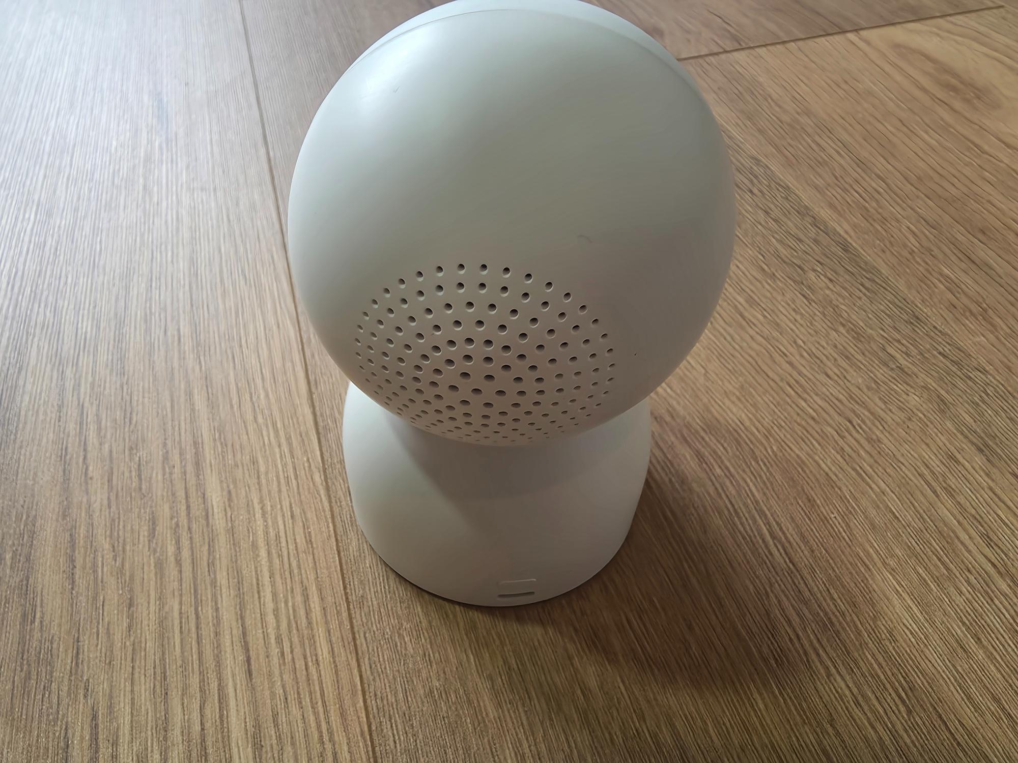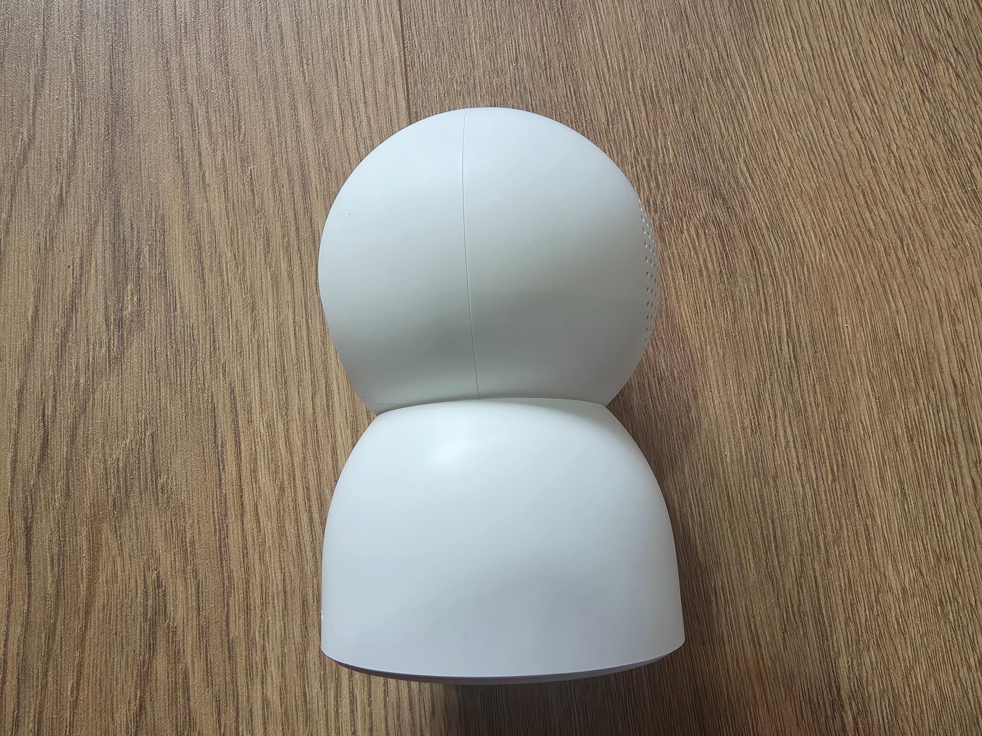 Die Xiaomi Kamera C701 ist, wie von Xiaomi gewohnt, in klassischem Weiß gehalten. Die Verarbeitung des Kunststoffs ist gut; zu große Spaltmaße oder Verarbeitungsfehler findet ihr keine. Mit 120mm in der Höhe ist die Kamera kompakt und die kreisrunde Grundfläche beträgt gerade einmal 79mm. Unterhalb des Standfußes befindet sich ein dünner Gummiring für einen sicheren Stand. Der Kamerakopf ist um 360° schwenkbar und in der Neigung um 109° beweglich. Der Sensor verbirgt sich hinter Acrylglas. Eine kleine Status-LED und die goldfarbene Umrandung der Linse vervollständigen die Erscheinung. Die verbauten Infrarot-LEDs sind nicht sichtbar.