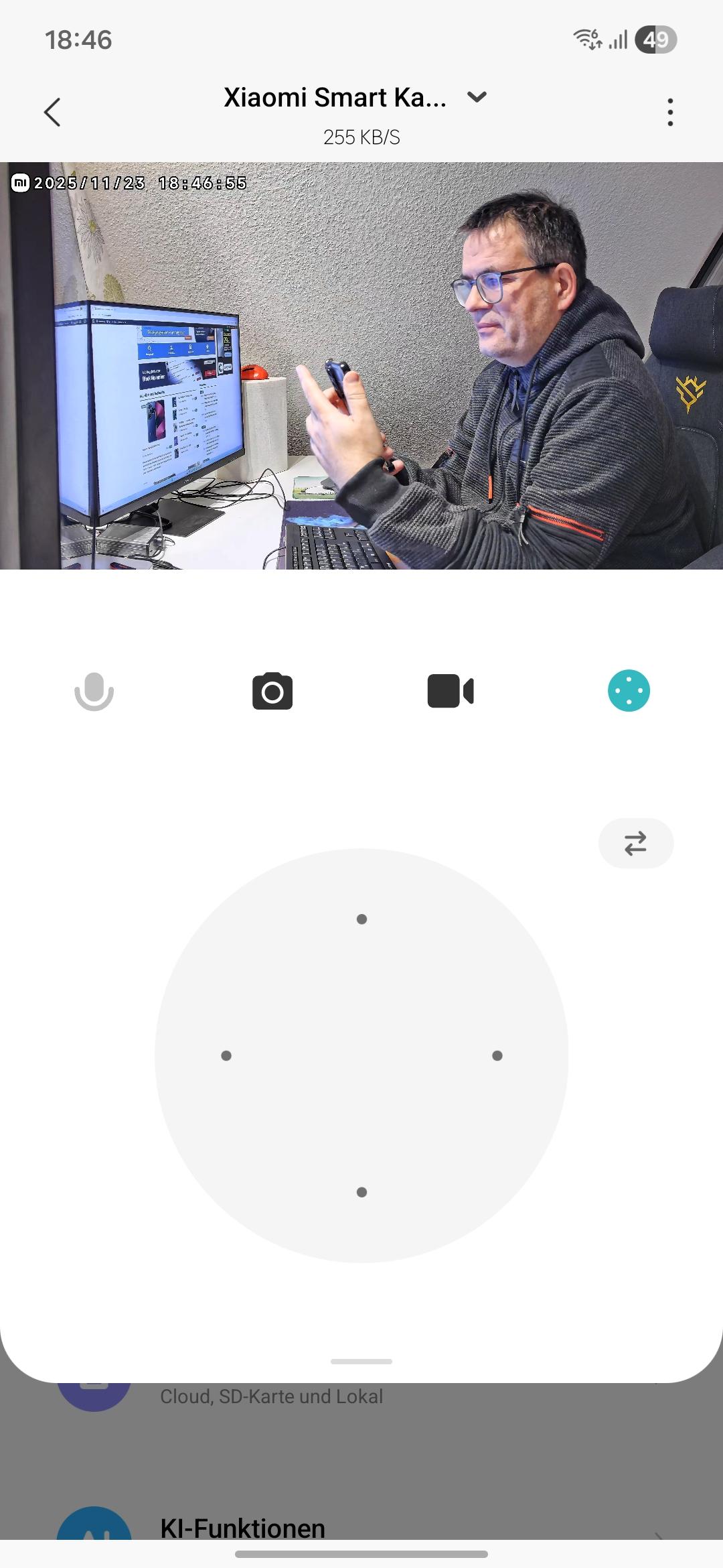 Im Startbildschirm in der App wird auch das Live-Bild der Xiaomi Kamera C701 angezeigt. Hier könnt ihr die Kamera frei bewegen, den Lautsprecher aktivieren, ein Foto schießen oder eine Aufnahme starten. Ein kleiner Touch auf das Bild genügt, um das Vollbild zu aktivieren oder die Bildqualität zu ändern. Ebenso kann hier die Kamera ausgeschaltet werden, wobei sich dann der Kamerakopf verdreht, sodass kein Bild mehr erzeugt wird. Der Antrieb des Kamerakopfes ist sehr leise und auch für ruhige Räume gut geeignet. Ich konnte gerade einmal 30dB(A) messen bei einem Abstand von 25cm. Im Ruhezustand hat der Raum 27dB(A).