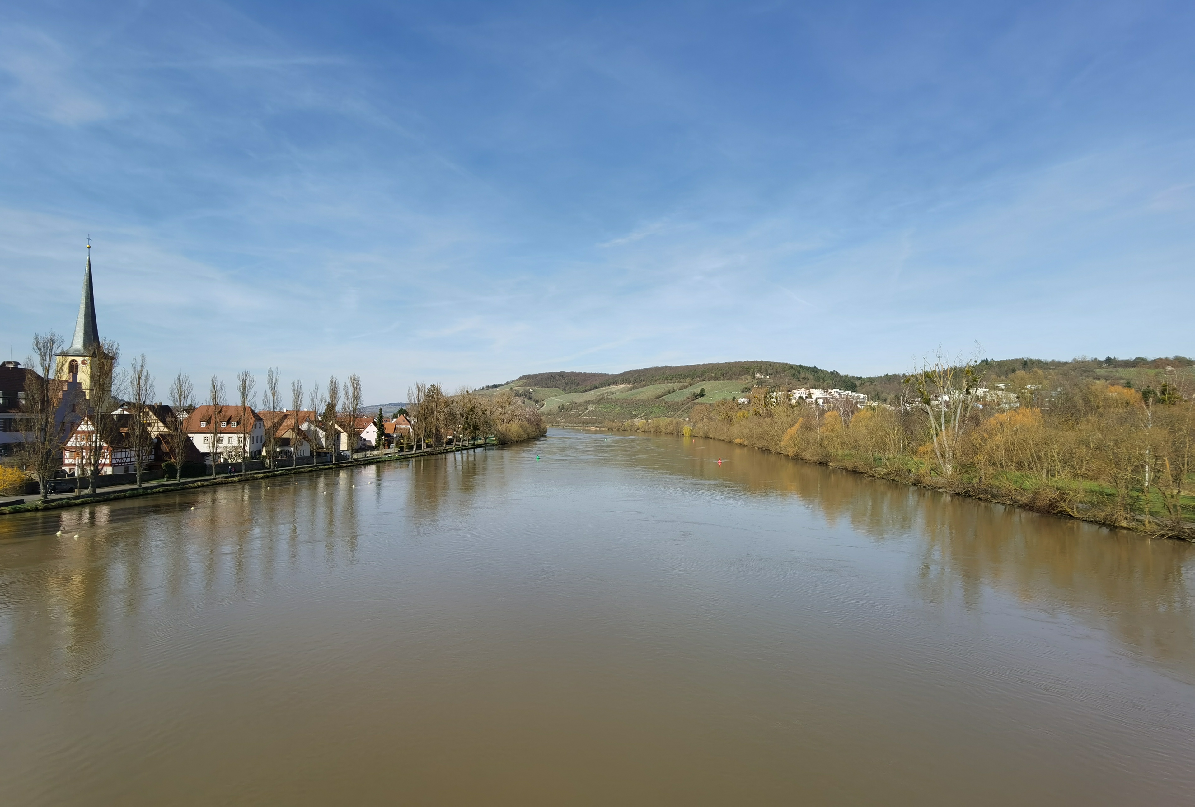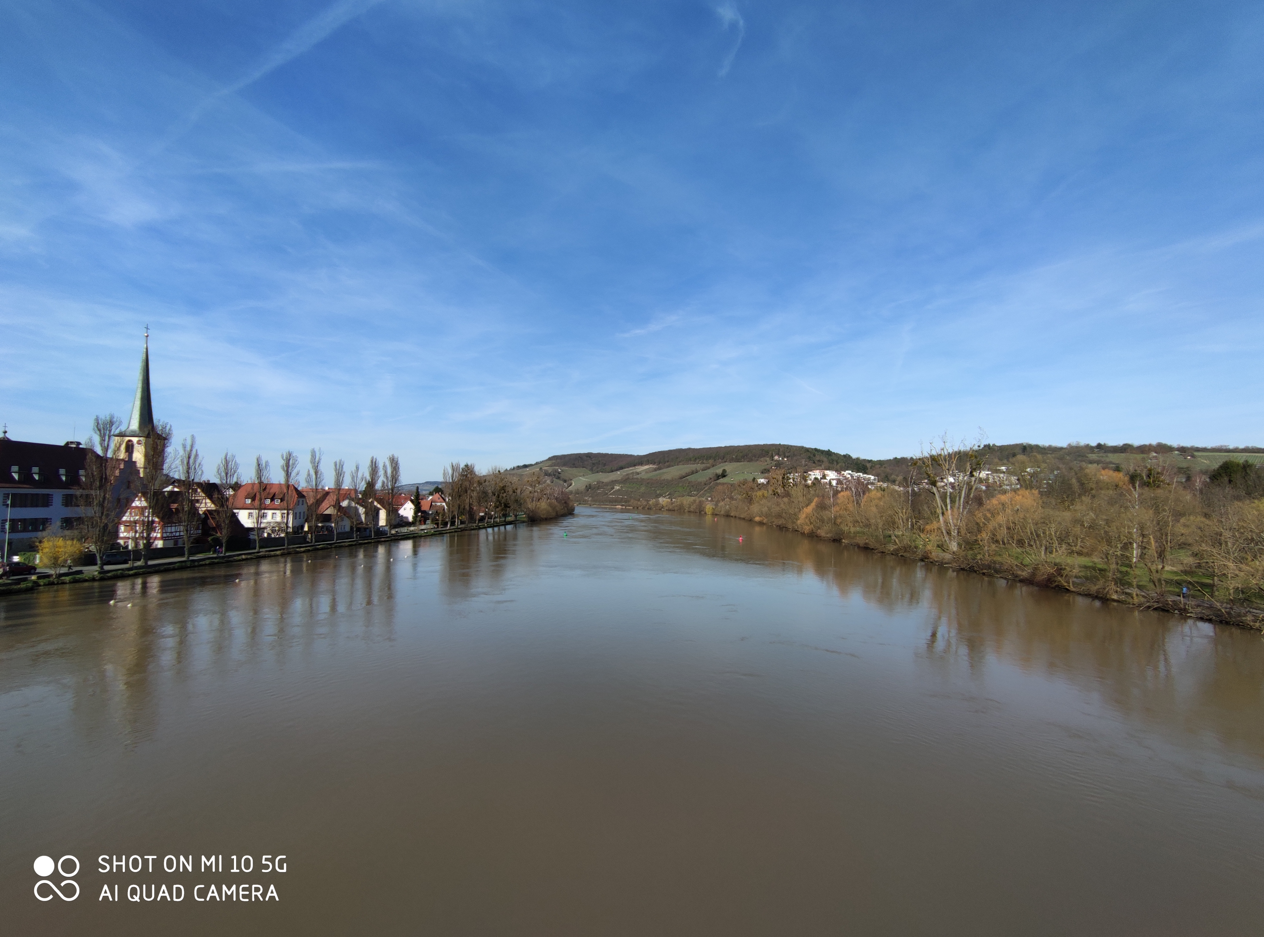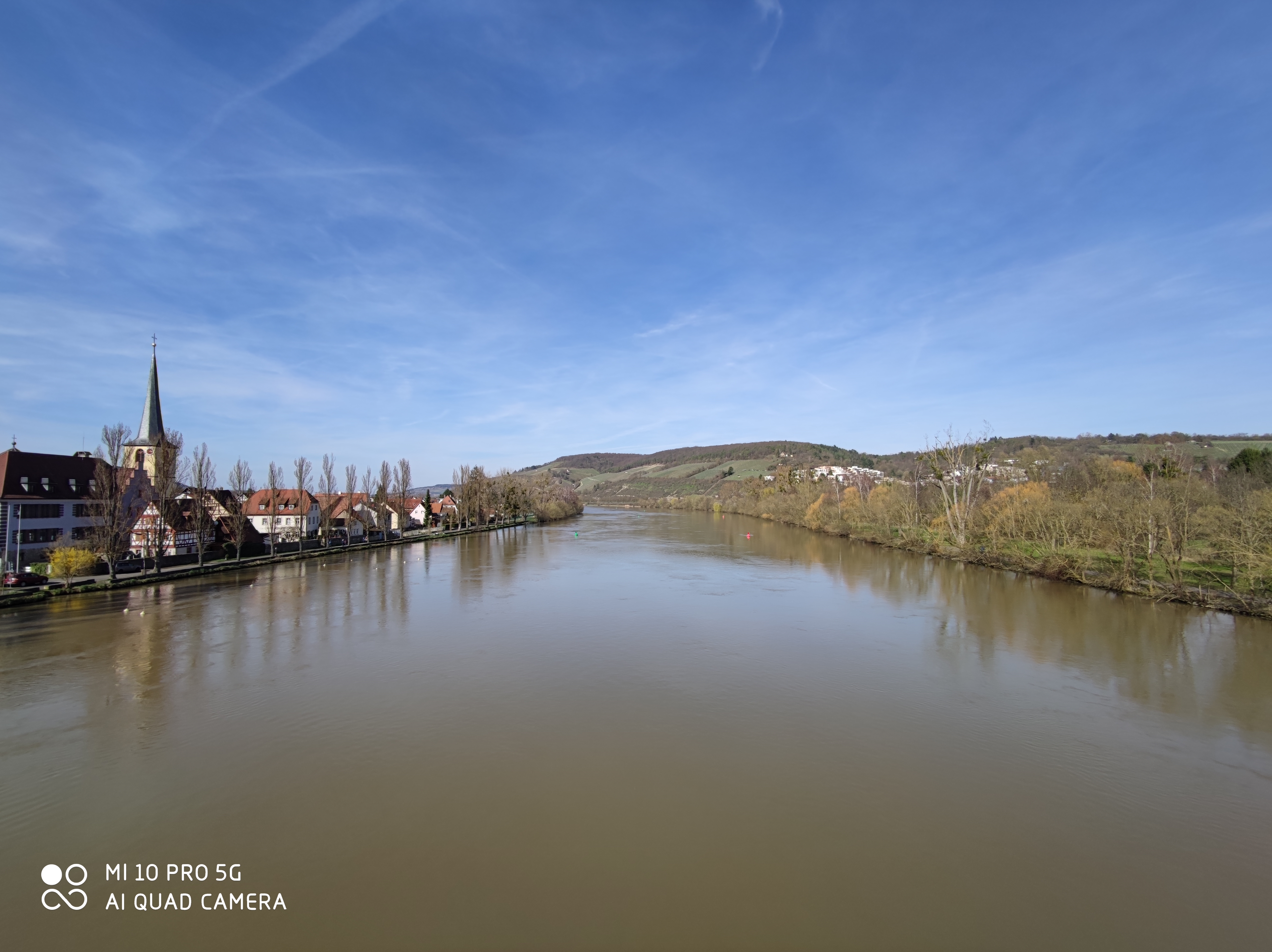 Beim Bild vom See greift die Software des Mi 10 pro stark ins Bild ein. Das sieht man insbesondere am Wasser und am Baum links. Die Einstellungen der Kamera-App waren bei beiden Geräten auf Standard. Dennoch ist das Ergebnis klar sichtbar und das Mi 10 pro produziert kräftigere Farben und eine andersfarbige Wasseroberfläche. Beim Zoom Bild auf die Kirche sieht man noch einmal den Detailsunterschied der Aufnahmen.