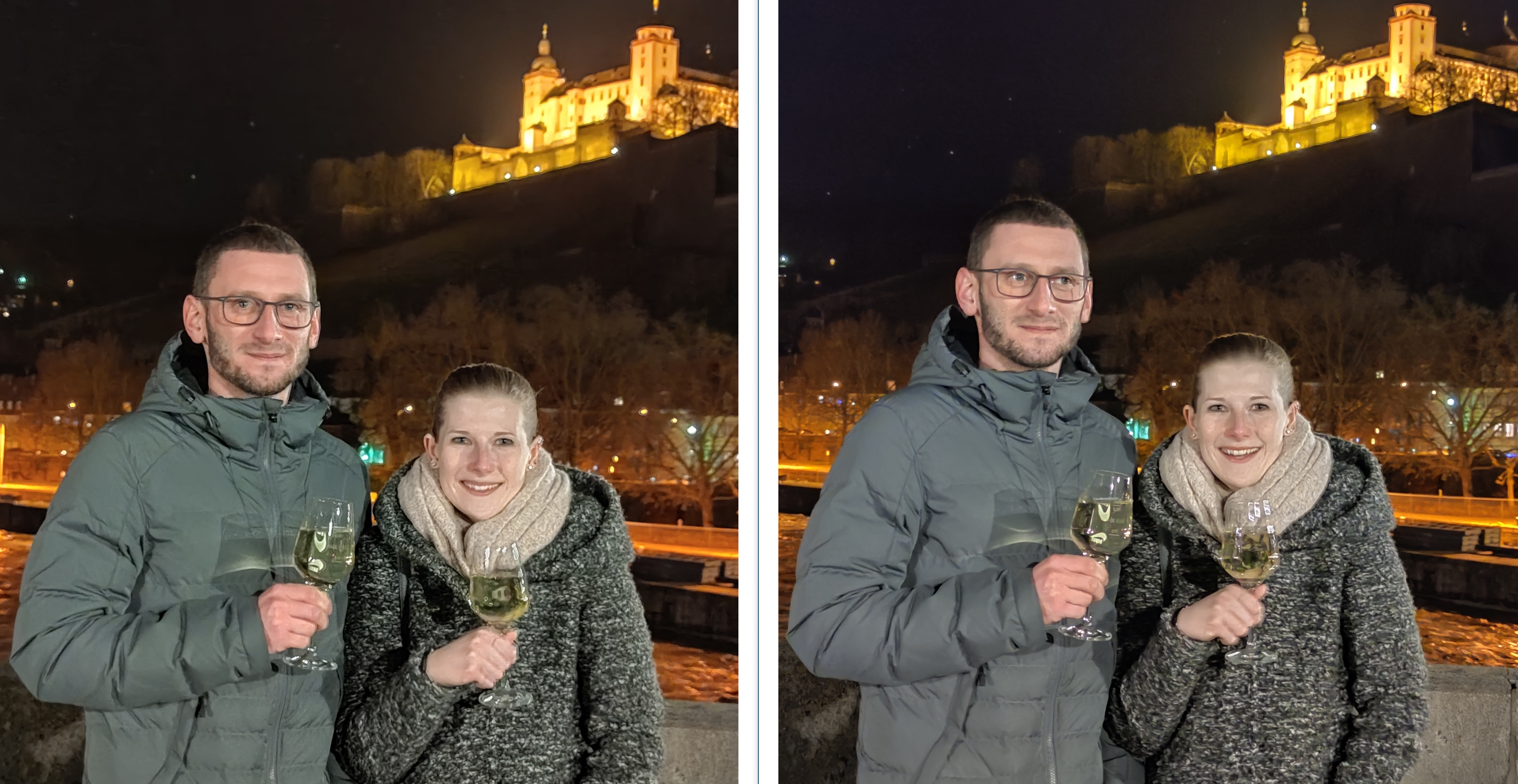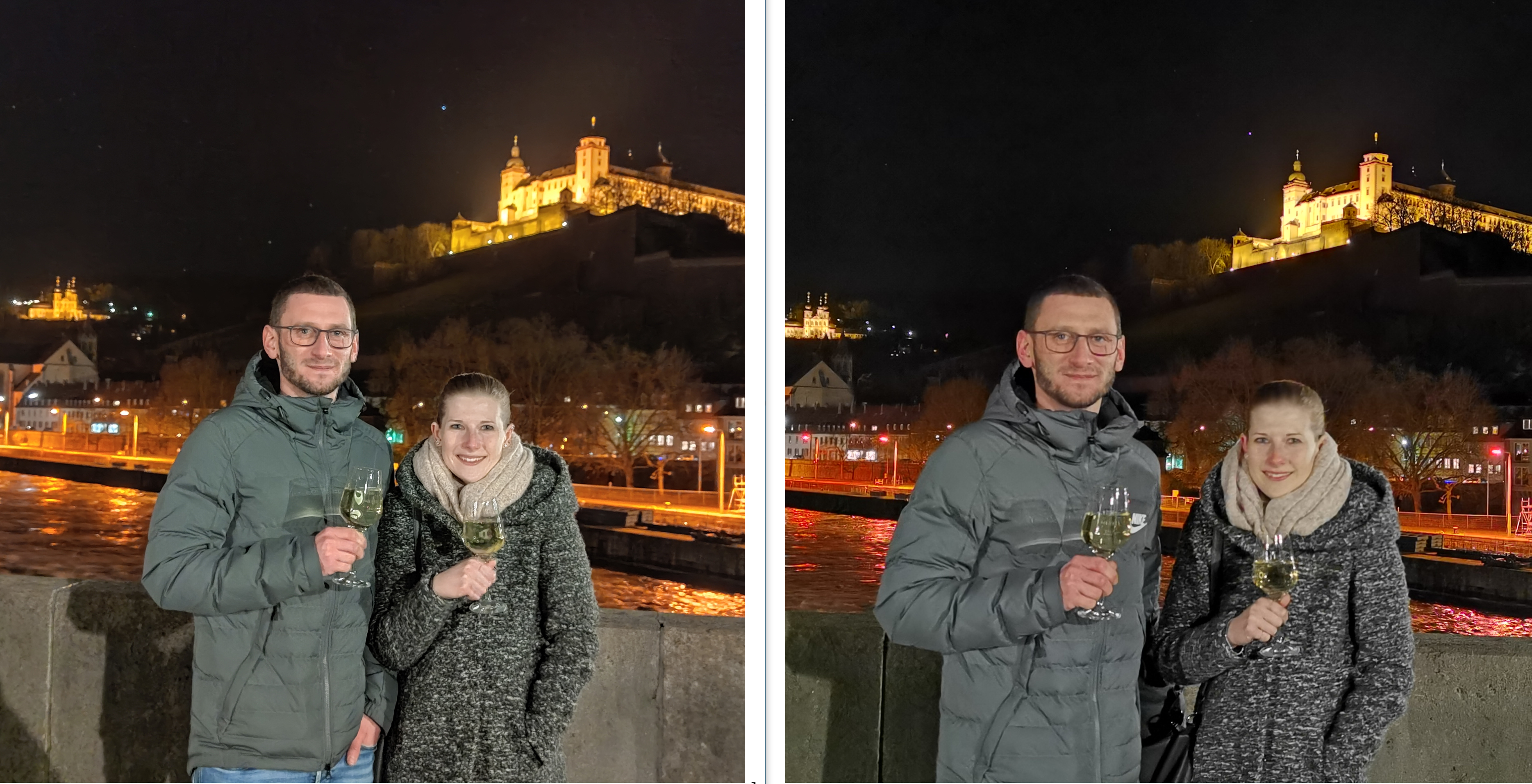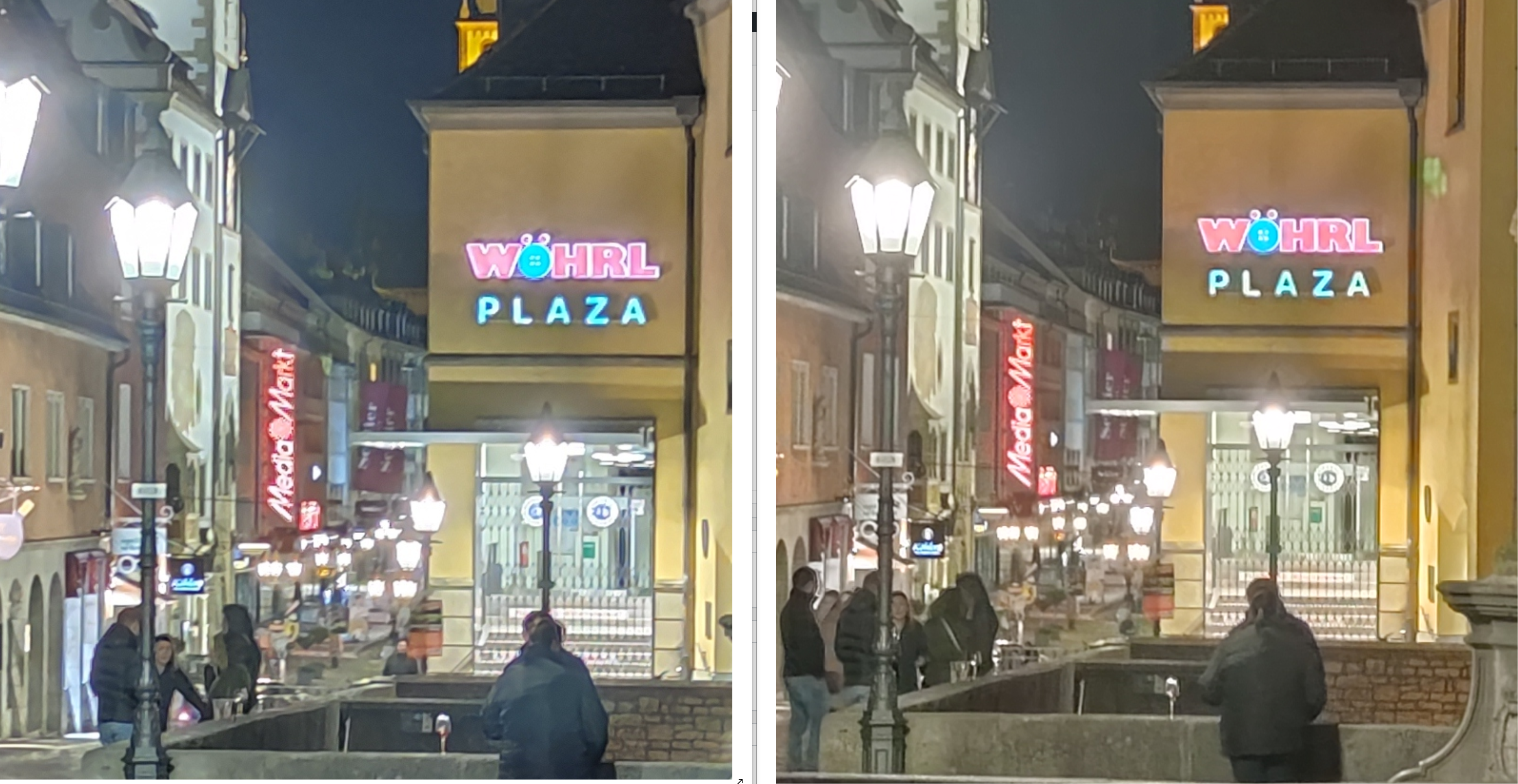 Die Nachtaufnahmen sind ein Duell auf Augenhöhe. Während Huawei den Hintergrund sichtbar besser hinbekommt, sind die Gesichter leider etwas unscharf. Xiaomi hingegen schärft per Software etwas zu stark nach, was teilweise zu einer etwas maskenhaften Darstellung von Gesichtern führt. In diesem ersten Scenario gewinnen das Mi 10 und Mi 10 Pro, die zu meiner Überraschung auch unterschiedliche Aufnahmen machen. Hier gelingt dem Mi 10 Pro die schönste Nachtaufnahme.