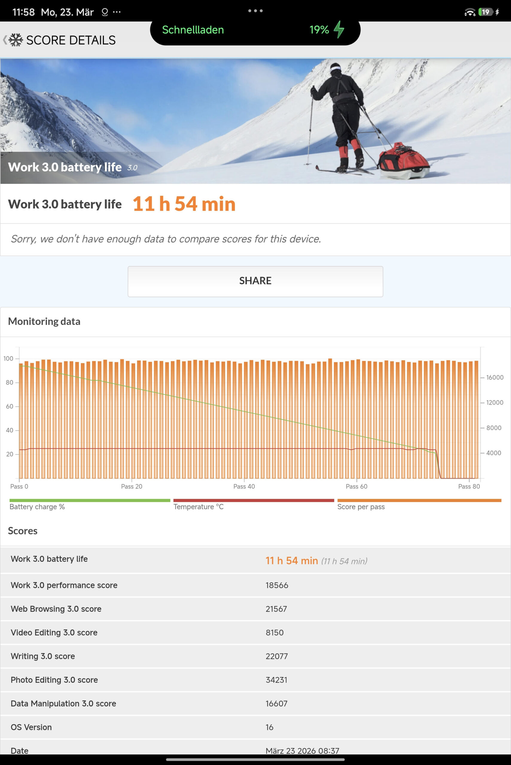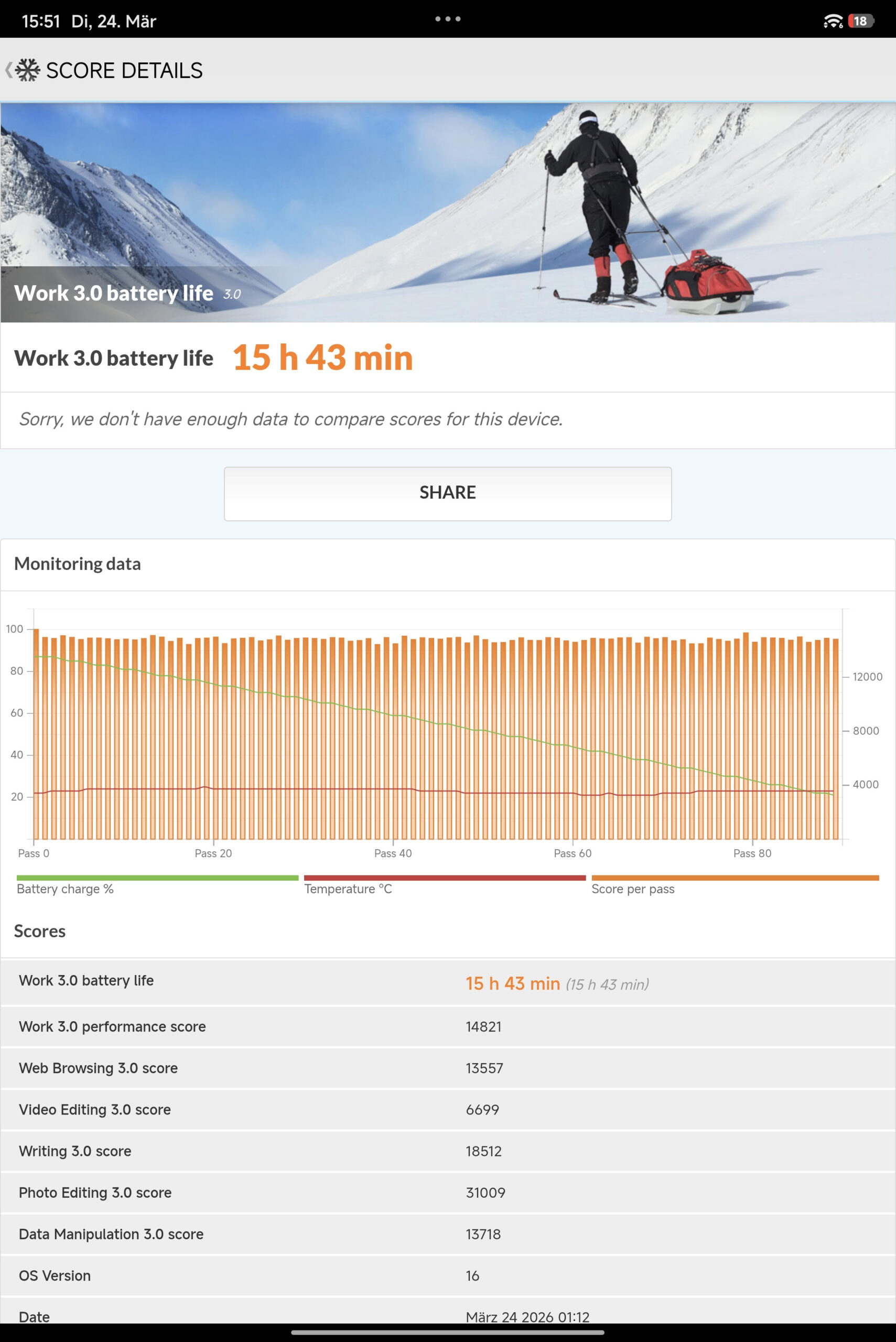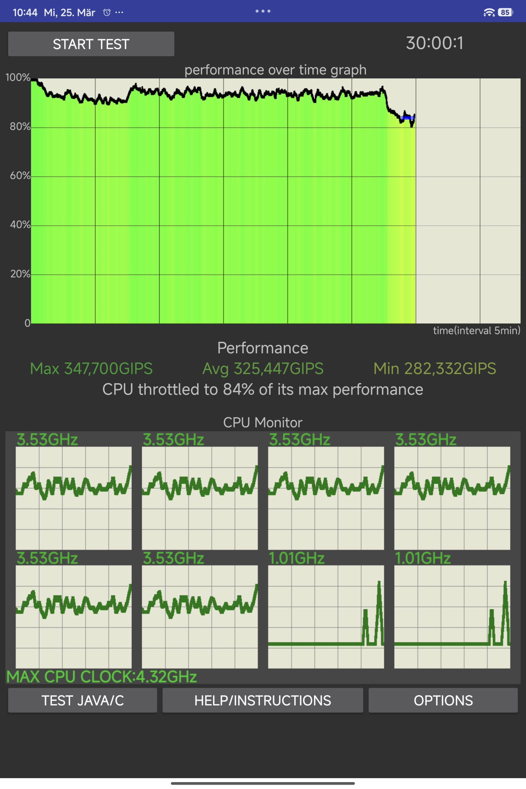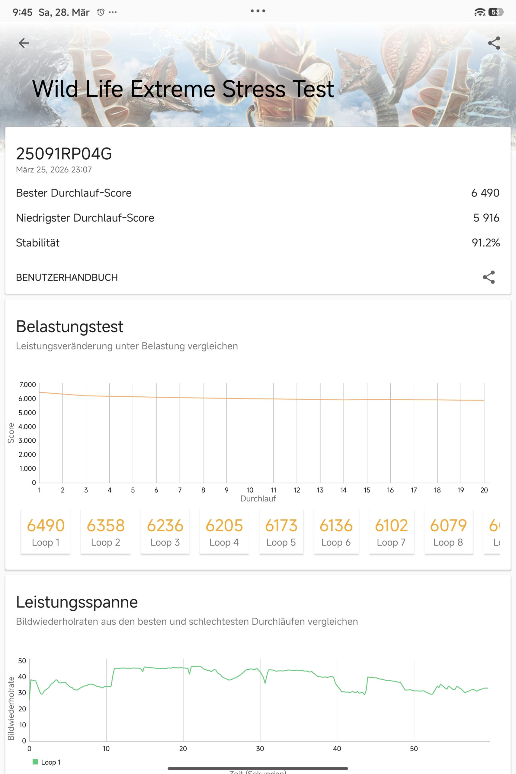 Besonders positiv fällt das Verhalten unter Dauerlast auf: Das Tablet bleibt sehr stabil und hat keine nennenswerten Probleme mit Thermal Throttling. Sowohl die Prozessor- als auch die Grafikleistung können dank der guten Kühlung dauerhaft auf einem hohen Niveau gehalten werden, ohne dass das System spürbar die Handbremse anziehen muss.