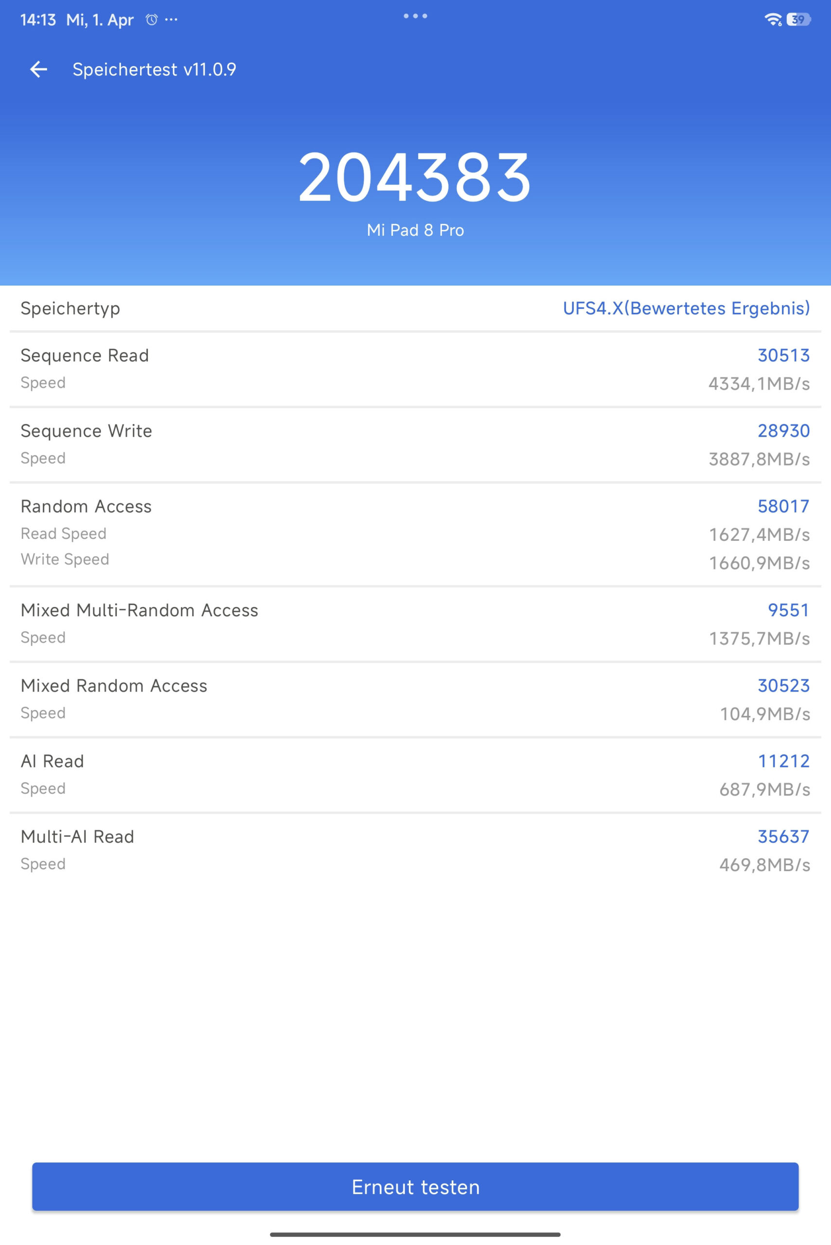 Beim Arbeitsspeicher habt ihr die Wahl zwischen 8GB, 12GB und 16GB. Während die 8GB-Version auf LPDDR5X-RAM setzt, verbaut Xiaomi ab der 12GB-Variante bereits den nominell schnelleren LPDDR5T-Standard. Wir bezweifeln allerdings stark, dass dieser unterschiedliche Typ im Alltag einen spürbaren Unterschied macht. Auch beim internen Speicher, der mit 128GB, 256GB oder 512GB zur Verfügung steht, gibt es technische Unterschiede zu beachten. Die kleinste Version mit 128GB nutzt UFS 3.1, während ab 256GB der schnellere UFS 4.1 Speicher zum Einsatz kommt. Dieser erreicht in den Messungen ausgezeichnete Werte von 4.300MB/s beim Lesen und 3.900MB/s beim Schreiben. Das ist wesentlich besser und ein spürbares Upgrade im Vergleich zur Standardversion des Xiaomi Pad 8 und wahrscheinlich auch zur 128GB-Version.