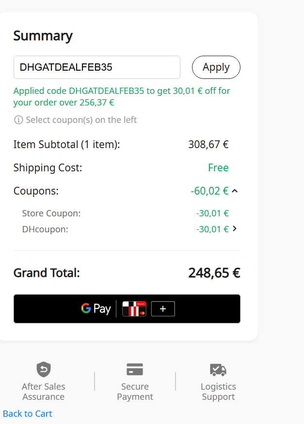 Servus, was wird bei dir denn angezeigt? Es gibt den Gutschein oben “DHGATDEALFEB35” und zusätzlich sollte noch ein Shop Coupon geladen werden. Dann klappt es auch. Versuch mal einen anderen Browser. Im Anhang ein Screenshot, wie es bei mir ausschaut.