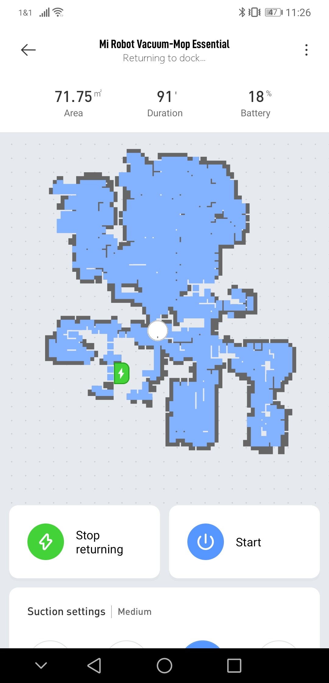 “Versuchen” trifft es hier oftmals auf den Punkt. Es hat teilweise den Anschein, dass der G1 weder gezielt, noch nach einem logischen Algorithmus zur “Basis” zurückkehrt. Teilweise sieht es fast so aus, also ob nach dem Zufallsprinzip die Wohnung abgefahren wird, bis irgendwann einmal die Ladestation in der Nähe ist! In der App selbst befindet sich dabei der Staubsauger oftmals irgendwo im Nirvana. In anderen Fällen wiederum klappt es hingegen reibungslos. Sofern der G1 dann einmal sein “zu Hause” gefunden hat, setzt er nach der Wiederaufladung sein Reinigungsprogramm fort. Beim Laden schiebt der semi-smarte Staubsaugerrobter eher eine ruhige Kugel. Je 30 Minuten Ladezeit werden im Schnitt 12% an neuer Akkukapazität zur Verfügung gestellt. Für eine vollständige Aufladung werden demnach locker 4 Stunden fällig. Kein wirklich guter Wert.