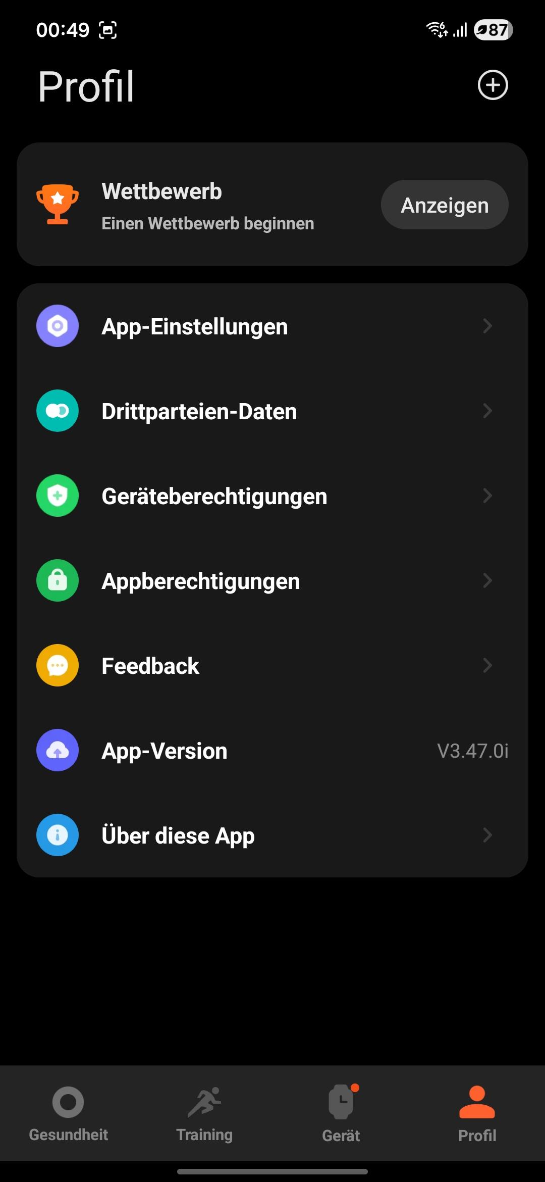 Die Bereiche sind selbsterklärend und komplett in deutscher Sprache verfügbar. Im Bereich „Gerät“ konfiguriert ihr die Xiaomi Watch S4 (41mm) umfangreich, sei es das Zifferblatt, die Benachrichtigungen, die Sortierung der Apps oder das Layout. Im Bereich „Profil“ bindet ihr Drittanbieter wie Zepp Life, Health Connect, Strava oder SUUNTO ein.
