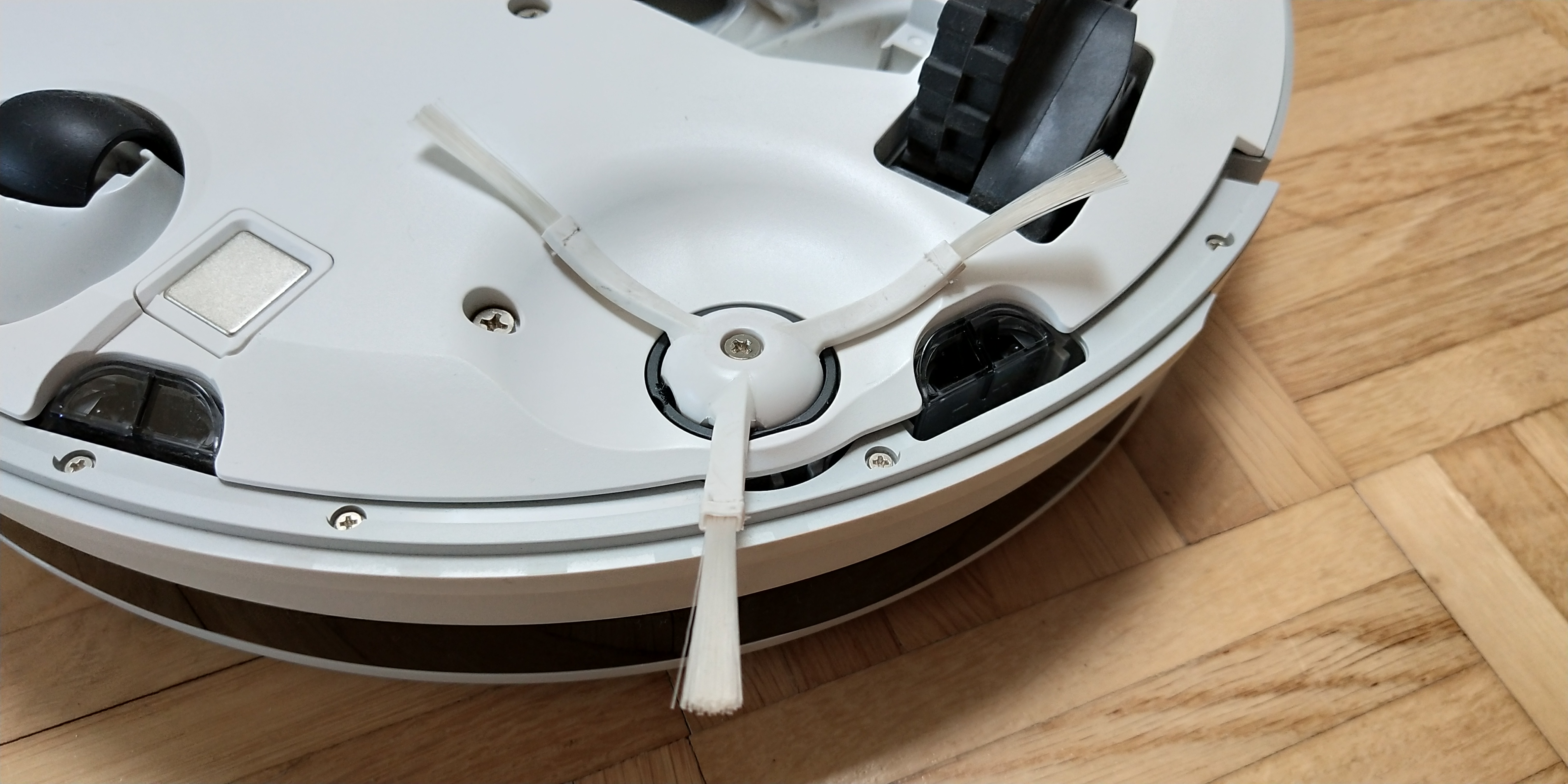 Der Robrock ist in schlichtem Weiß gehalten, hat aber dennoch einen sehr modernen Look und ist tadellos verarbeitet. Lediglich der Aufprallschutz, der Bumper, ist in Grau gehalten. Sofern der Sauger ein Hindernis während des Saugvorgangs erkennt, wird die Geschwindigkeit gedrosselt bis es zum sanften Anstoß kommt. Daraufhin dreht der Roborock ein Stück und führt seine Aufgabe fort. Die 2 großen Gummilaufräder sind aus weichen Gummi gefertigt um etwaige Schlieren auf dem Parkettboden zu unterbinden.