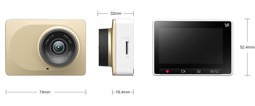 Das Gehäuse der Smart DashCam ist vollkommen frei von Metall und besteht zu 100% aus Kunststoff, ist aber dennoch sehr gut verarbeitet. Laut Hersteller wurden zudem ausschließlich umweltverträgliche Materialien im Gerät verbaut. Sie ist in 2 unterschiedlichen Farben verfügbar. Zur Wahl stehen Anthrazit und Gold. Zudem ist die Kamera mit gerade einmal 72,2g extrem leicht. Die Maße der Kamera betragen 74,2 x 52,3 x 19,8mm (ohne Linse), bzw. 74,2 x 52,3 x 31,8mm mit Linse und sie verfügt über ein 2,7“ großes TFT 16:9 Display, welches mit 960 x 240 auflöst. Hierbei handelt es sich jedoch nicht um einen Touchscreen. Die Bedienung erfolgt ausschließlich mittels der 4 Tasten unterhalb der Displays.