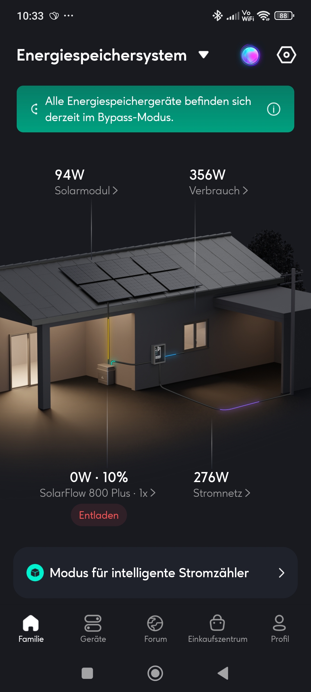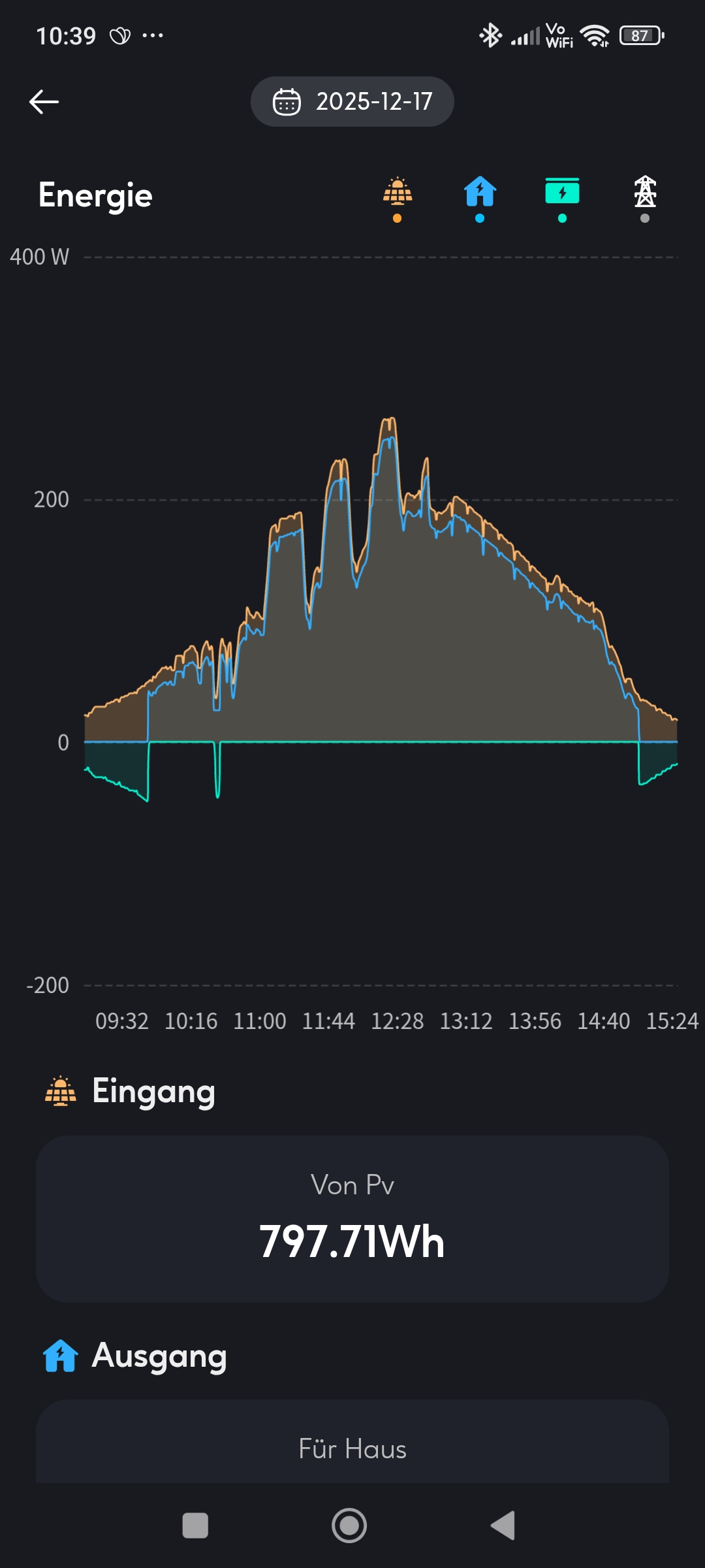 Dennoch können wir zur Mittagszeit Leistungsspitzen von bis zu 1.000W messen. Aufgrund der niedrigen Startspannung beginnt das Solarflow 800 Plus bereits in den frühen Morgenstunden, Strom zu produzieren. Im Vergleich zu einem Hoymiles HMS-800-2T (zum Test) starten beide Systeme in etwa zeitgleich die Stromproduktion. Wurde in der Nacht die untere Entladegrenze erreicht, startet das System erst einmal die Akkuladung, bis das untere SoC-Limit wieder erreicht wurde. Liegt die Stromproduktion noch unterhalb des Hausbedarfs, schaltet das Solarflow in den Bypass-Modus und versorgt erst einmal euren Haushalt. Hierbei wird die Energie nicht zwischengespeichert, sondern direkt eingespeist. Sobald die PV-Produktion höher als die Hauslast ist, schaltet das System in den Akkuladebetrieb in Kombination mit dynamischer Einspeisung. Die Kommunikation zum Smart-Meter (Shelly Pro 3EM, Zendure D0 Smart-Meter oder Ecotracker) wurde in den vergangenen Monaten durch Software-Updates für alle Zendure-Systeme verbessert. Laständerungen im Haushalt werden in rund drei Sekunden erfasst und die Ausgangsleistung passend eingeregelt. Die Regelung trifft dabei fast den Nullpunkt, sodass lediglich noch 0–5W aus dem Netz bezogen werden. Somit lässt sich bis zu einer Hauslast von 800W der Netzbezug fast vollständig kompensieren. Verfügt euer Haushalt bereits über eine große Solaranlage, lässt sich das Solarflow 800 Plus genauso einfach mittels PV-Überschuss aufladen. Sobald der Smart-Meter im Hausnetz einen Energieüberschuss von mindestens 50W erfasst, schaltet das System automatisch in den Ladebetrieb um und lädt den Akku mit bis zu 1.000W über das Stromnetz. Das bedeutet, dass lediglich Überschussleistungen oberhalb der 50W-Schwelle aufgenommen werden. Die Umschaltung vom Ladebetrieb in den Einspeisebetrieb erfolgt fast ohne Verzögerung. Generell arbeitet die dynamische Einspeisung mittels Smart-Meter bereits seit Wochen völlig problemlos und zuverlässig.