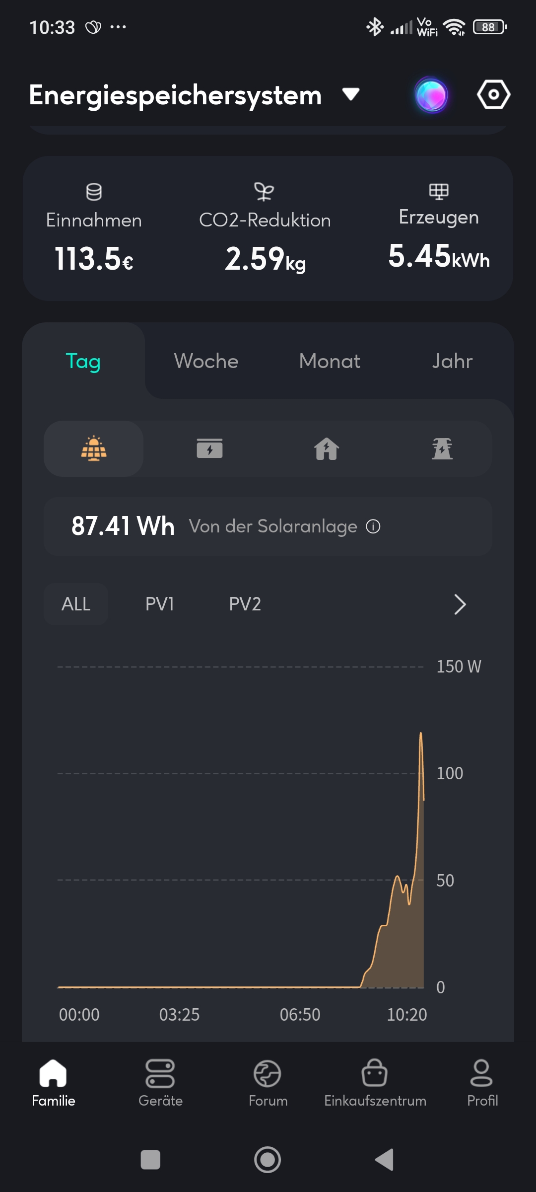 Für den Test unter realen Bedingungen versorgen wir das Solarflow 800 Plus mit vier Trina Vertex 415W Solarmodulen. Jeweils zwei Solarmodule werden pro Eingang parallelgeschaltet. Da wir uns momentan im Winter (Dezember) befinden, fällt der Tagesertrag mit 1–2kWh entsprechend gering aus.