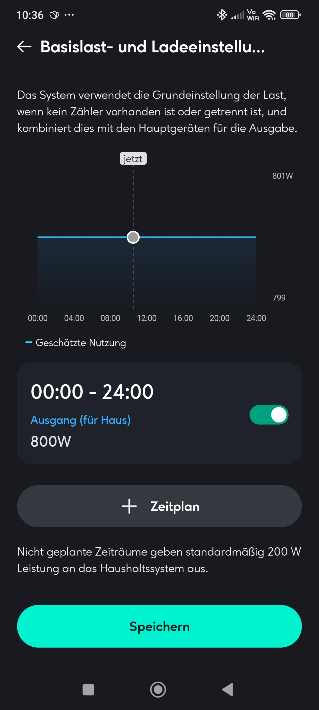 Im Grundlastmodus könnt ihr individuelle Zeitpläne für das Einspeisen oder die Ladung eurer Akkus festlegen. Hier lässt sich minutengenau festlegen, wann und wie viel das System in euren Haushalt einspeisen soll. Bei Bedarf könnt ihr auch Zeiten konfigurieren, in denen der Akku aus dem Hausnetz aufgeladen werden soll.