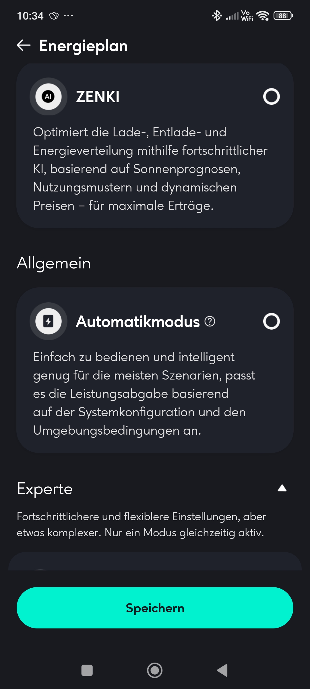 Der Automatikmodus ähnelt dem ZenKI-Modus, bietet allerdings keine Unterstützung durch künstliche Intelligenz. Das bedeutet, Ertragsprognosen und Lastspitzen werden nicht in die Verbrauchsoptimierung einbezogen. Dennoch profitiert ihr von einem automatisierten Betrieb, der entweder euren Einspeisebetrieb nach den Informationen des Smart-Meters ausrichtet oder Smart-Plugs beziehungsweise den Grundlastmodus als Bezugsquelle auswertet. Das bedeutet, wenn die Nutzung eines Smart-Meters nicht möglich ist, richtet sich das System nach dem Grundlastmodus (zeitgesteuerte Einspeisung) und reagiert zusätzlich auf den Bedarf, der von den Smart-Plugs (intelligente Steckdosen) geliefert wird.