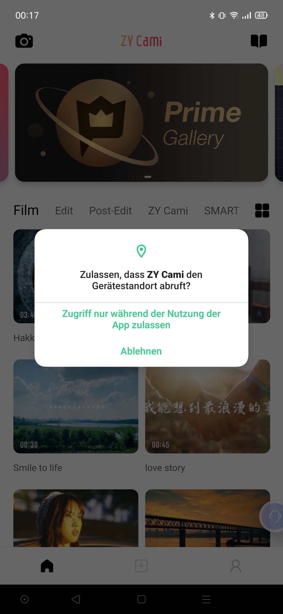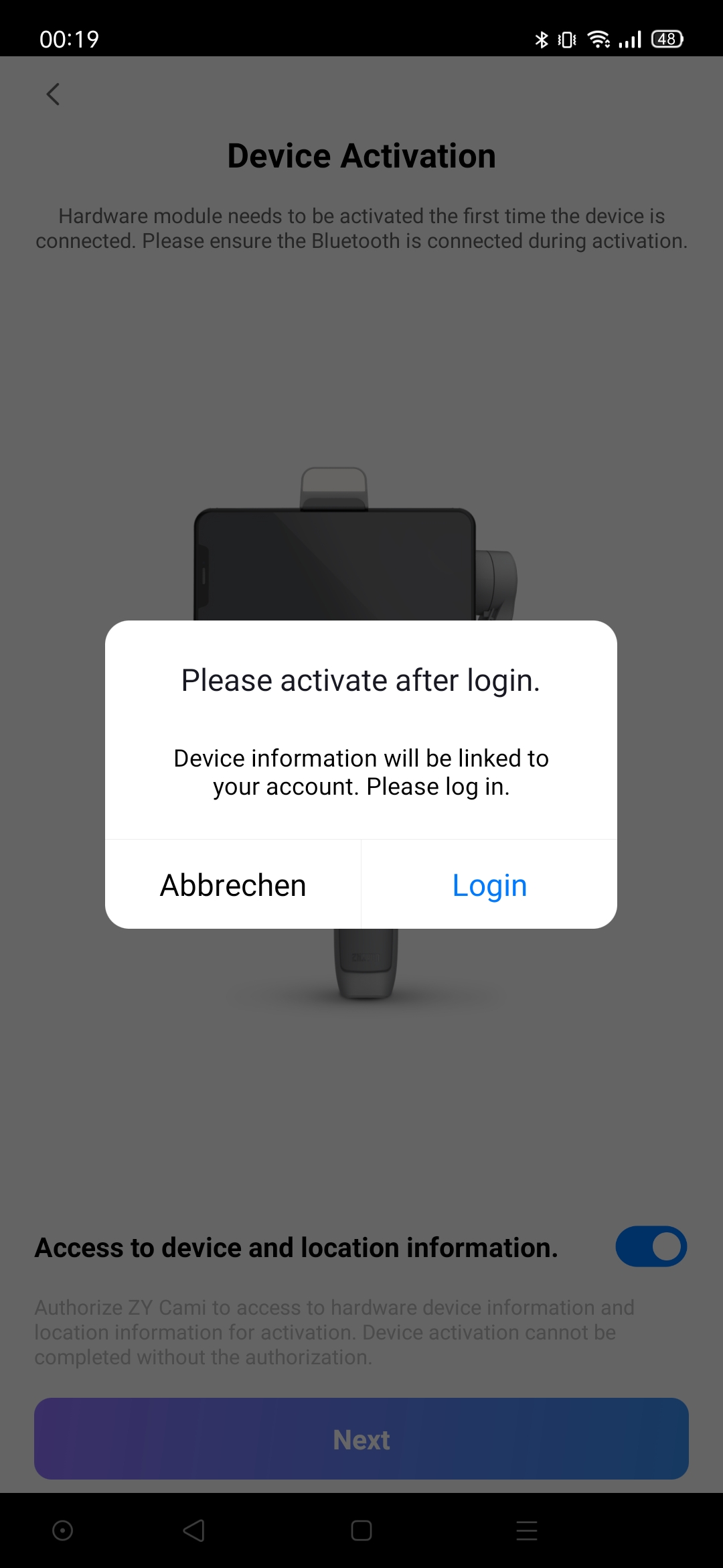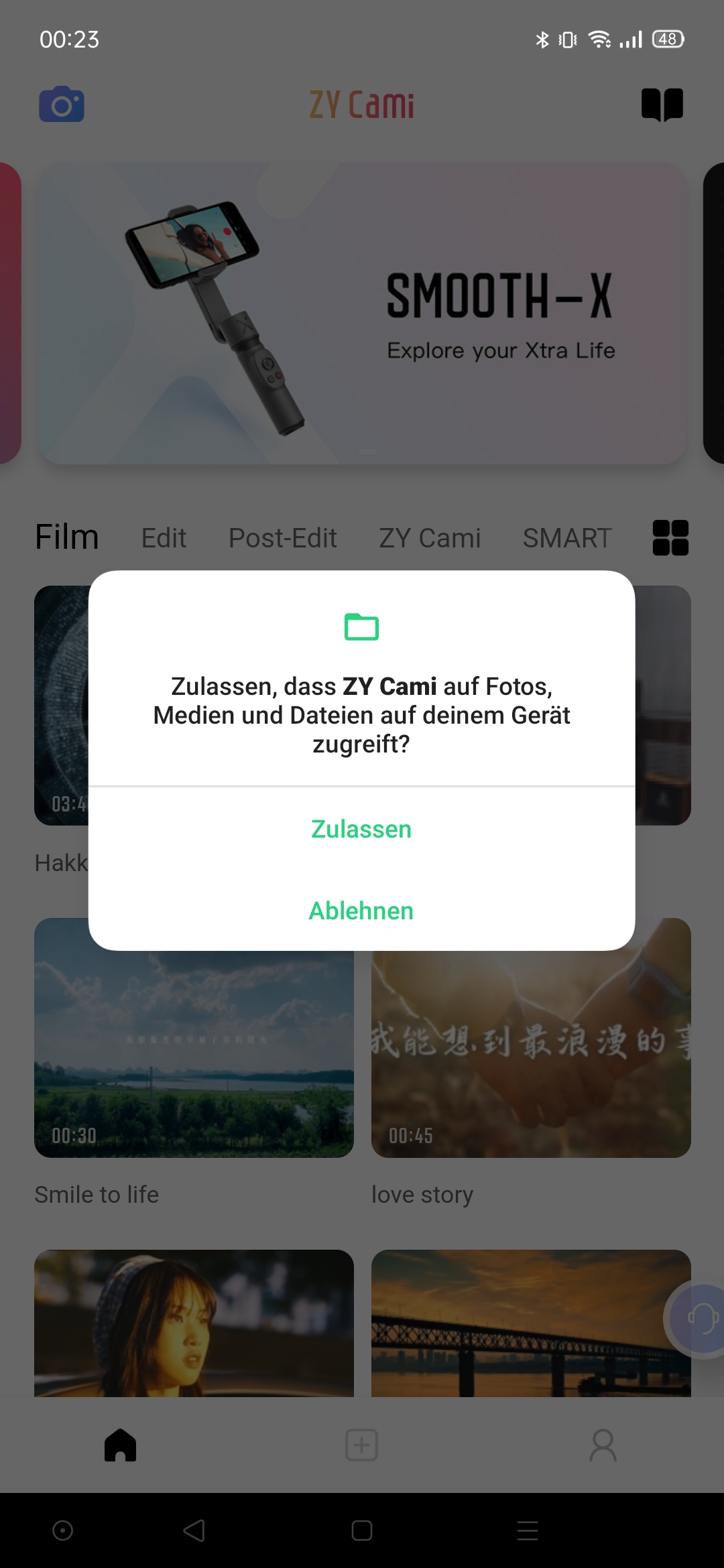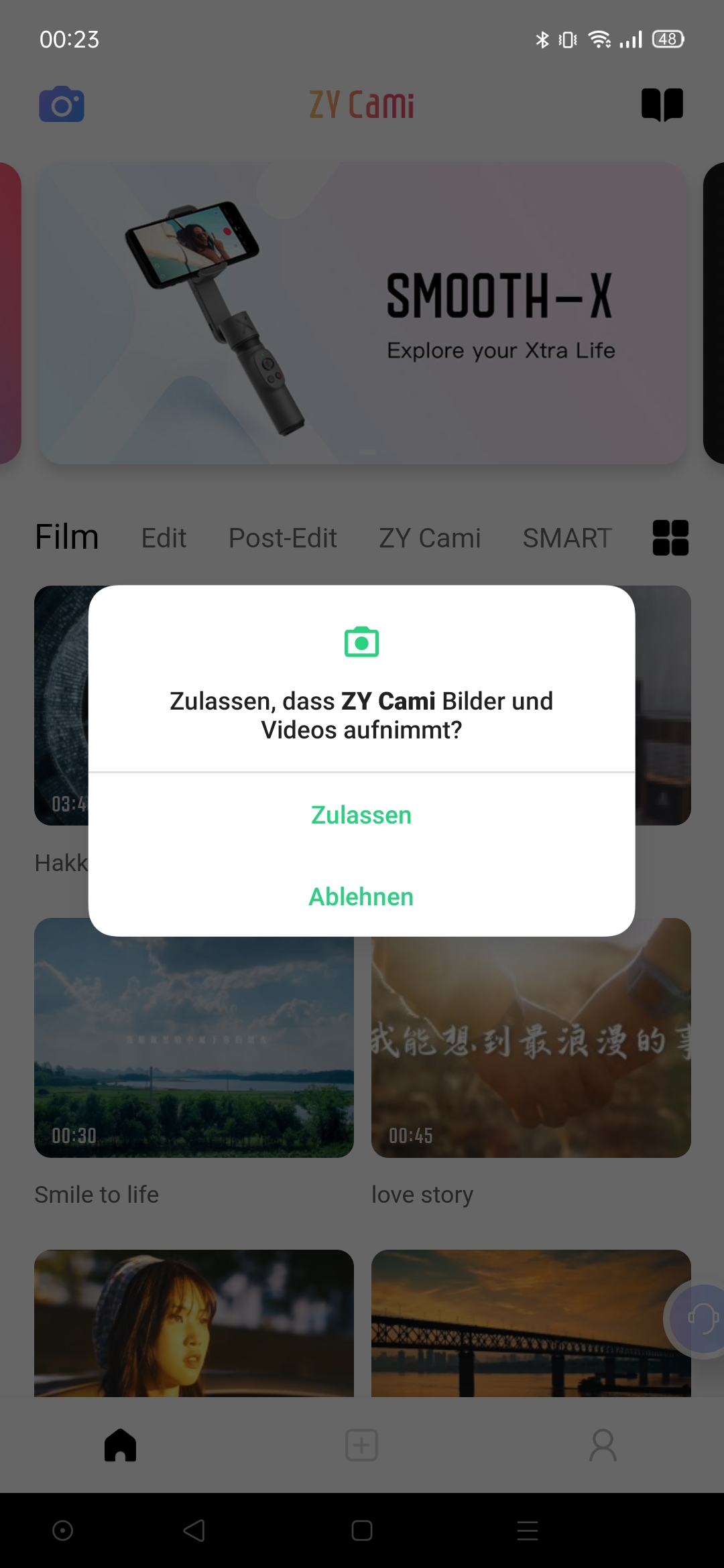 Nach Betätigen des Power-Buttons kann es theoretisch, wenn ihr lieber auf die hauseigene Kamera-App eures Smartphones zurückgreifen möchtet, losgehen. Natürlich könnt ihr so weder alle Features noch alle Buttons des Gimbals nutzen. Beim Erststart der Zy Cami App müssen noch die benötigten Berechtigungen (BT, GPS, Kamera, Audio) gestattet werden. Anschließend müsst ihr euch, klar…wie sollte es auch anders sein, beim Hersteller registrieren. Hierfür reicht aber eine E-Mail-Adresse und ein frei wählbares Kennwort. Nutzt bitte zur Registrierung vorsichtshalber einen eurer Spam-E-Mail Accounts. Seit der Erstellung meines Zhiyun-Account erreichen mich komischer Weise vermehrt Werbenachrichten für Fotobücher und Co.! Ob es hier einen Zusammenhang gibt? Hmmm, ich frage einmal bei Sherlock an! 🙂